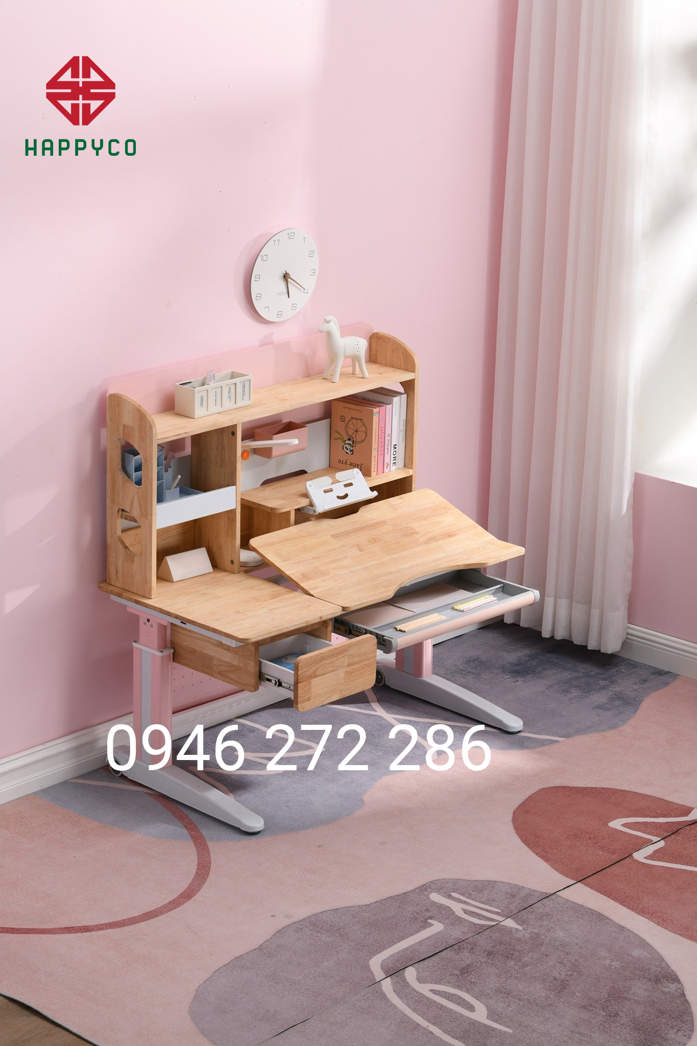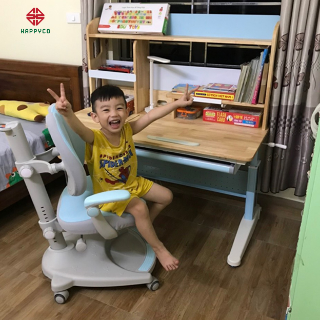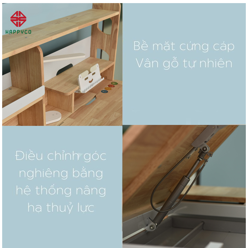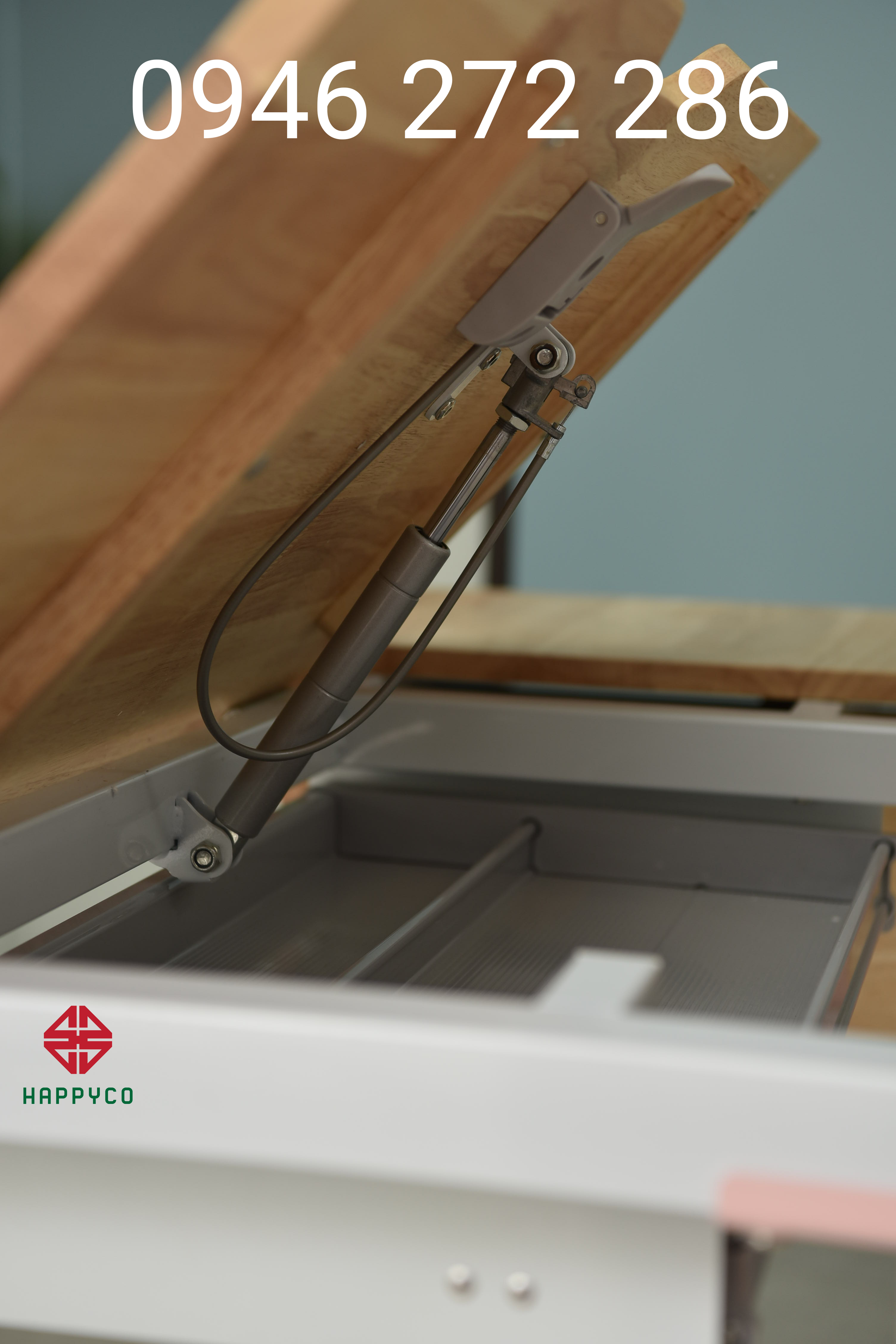 Bàn có thể điều chỉnh độ nghiêng 0º đến 50º bằng trục nâng hạ thuỷ lực; tạo “khoảng cách vàng” giúp bé không cần phải nheo mắt hay cúi đầu xuống khi chép bài; bảo vệ thị lực hiệu quả hơn.