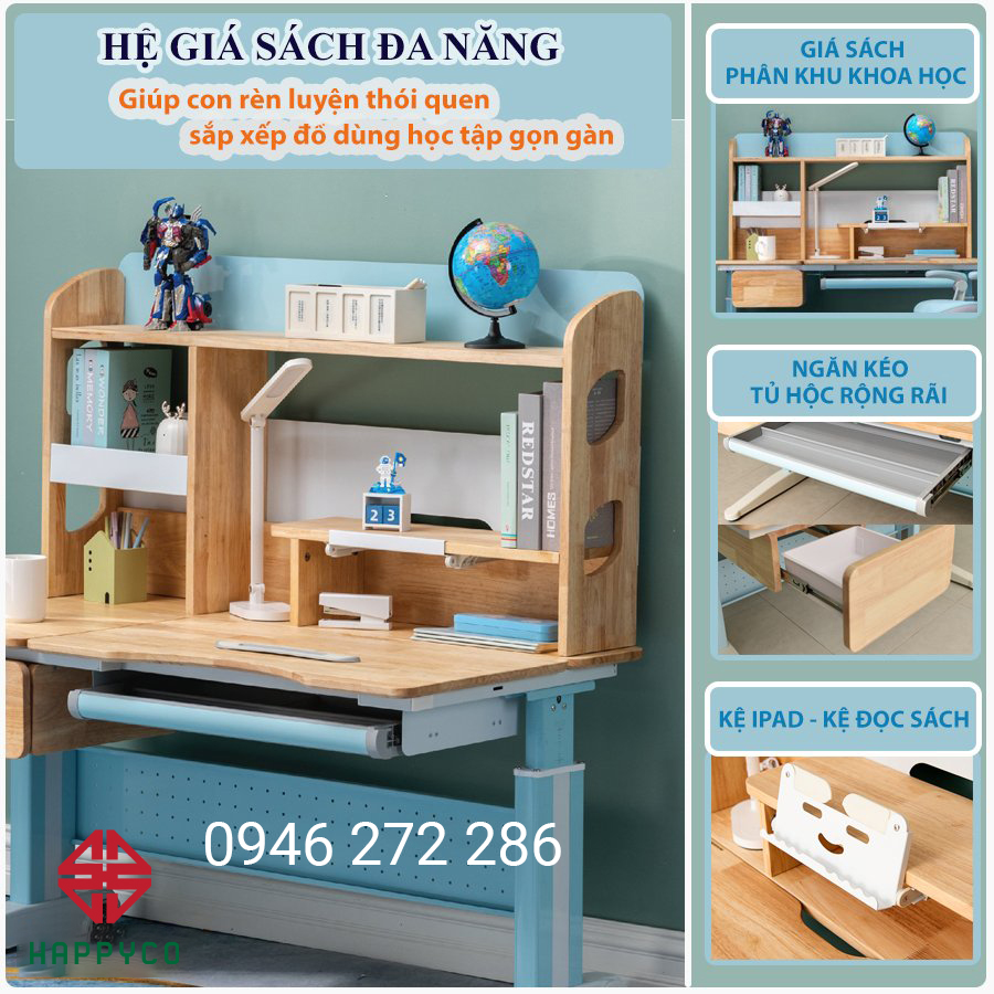 Giá sách rộng rãi, chia thành 4 tầng phân khu khoa học giúp dễ dàng bố trí và đơn giản hoá việc phân loại; sắp xếp đồ dùng học tập. Ngoài công dụng sắp xếp sách vở còn có thể để được màn hình máy tính. Vách ngăn thông minh đủ chỗ cho một màn hình máy tính lớn và thiết kế hệ kệ; hộc cho bé thỏa sức tận dụng nhiều không gian sắp xếp các đồ dùng khác.