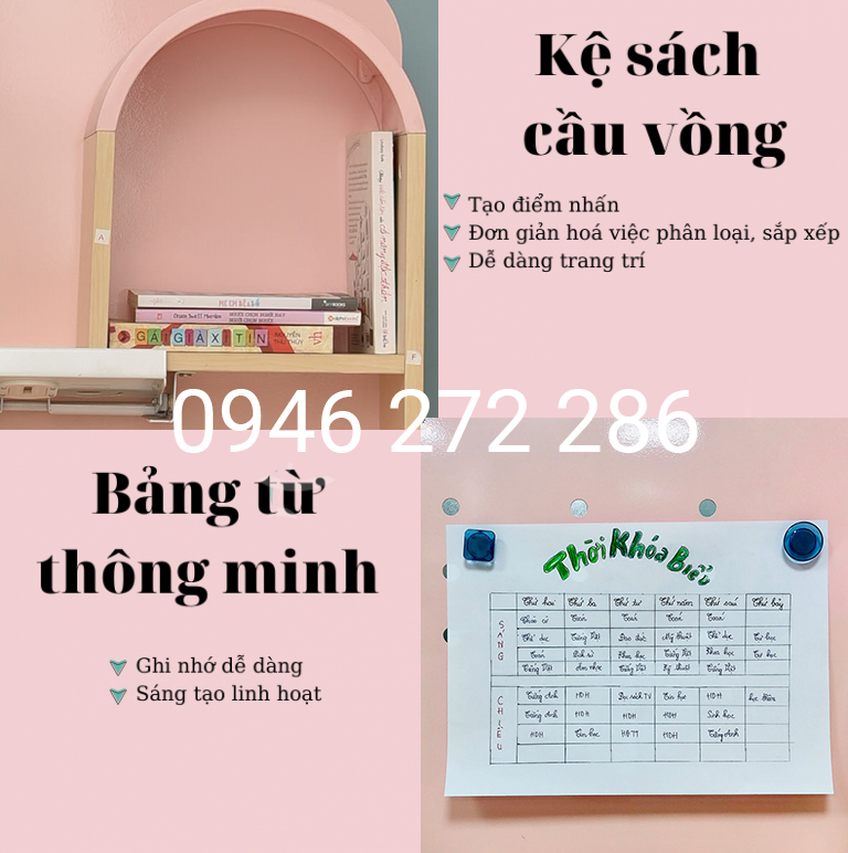 Tích hợp giá sách rộng rãi, với thiết kế cầu vồng nổi bật và bảng từ thông minh sẽ giúp con dễ dàng bố trí và đơn giản hóa việc phân loại, sắp xếp đồ dùng cũng như trang trí góc học tập của riêng mình.
