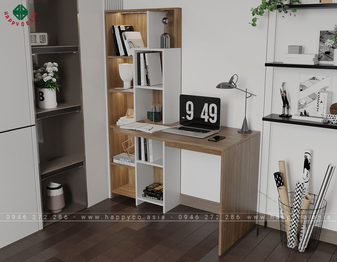 Thiết kế thông minh: Bàn tích hợp kệ sách nhiều tầng bên cạnh, cho phép bạn lưu trữ sách vở, tài liệu, và các vật dụng cần thiết ngay tại nơi làm việc. Kệ sách được thiết kế với nhiều kích thước khác nhau, phù hợp với nhiều loại đồ dùng.