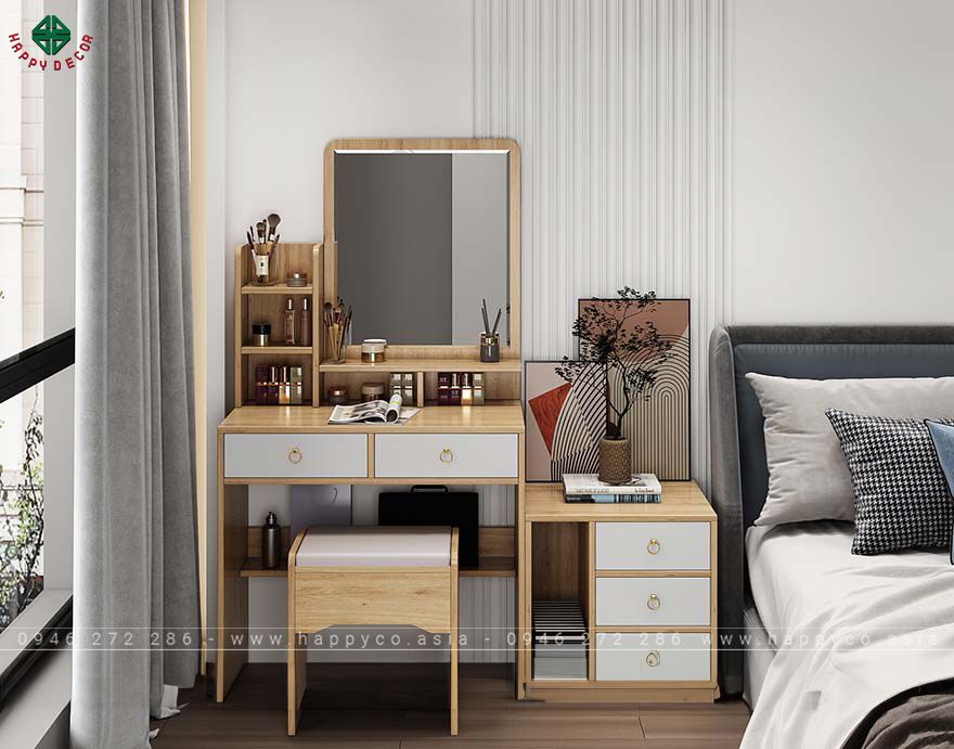 Ngoài ra, tủ còn thiết kế kèm theo một tủ ngăn kéo, khi đặt bàn trang điểm cạnh giường chiếc tủ ngăn kéo này giống như một chiếc TAB đầu giường nhỏ để gia chủ đặt đèn ngủ, đồng hồ báo thức, sách, …. Sản phẩm tạo cho quý khách sự thích thú và thắp sáng không gian phòng ngủ nhà bạn.