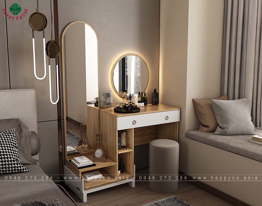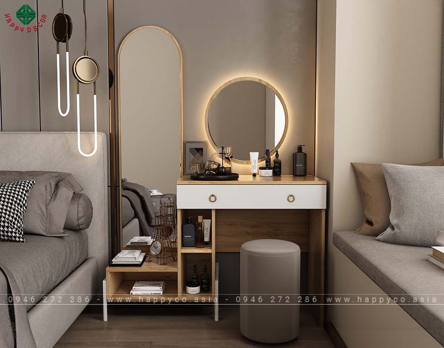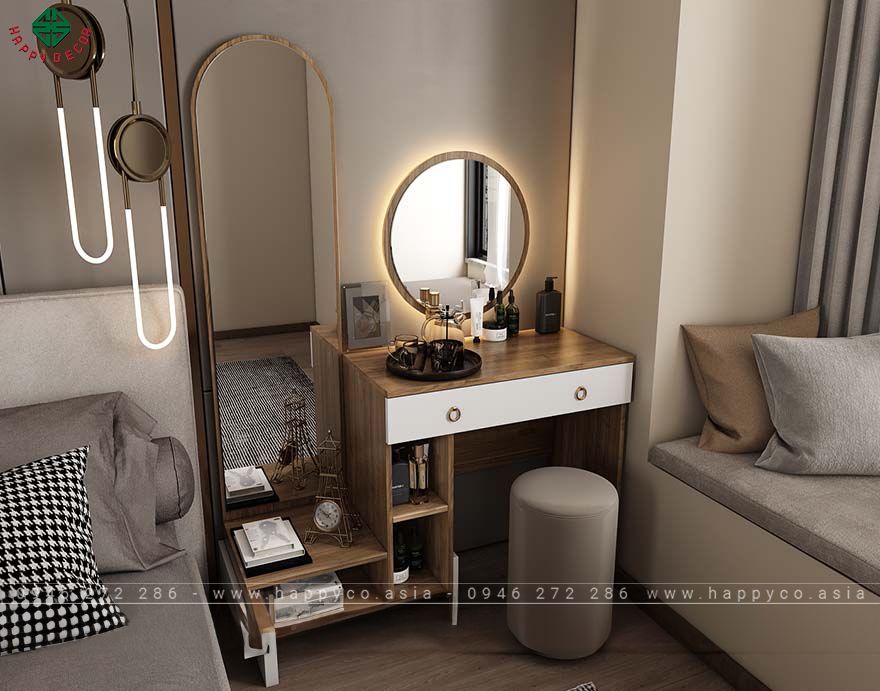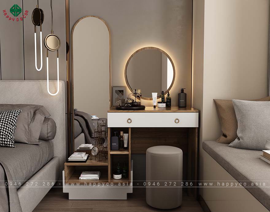 Về công năng: bàn có 2 ngăn kéo lớn giúp bạn cất mỹ phẩm và các đồ dùng khác gọn gàng, tạo thẩm mỹ cho không gian. Một bên chân bàn trang điểm được thiết kế thành nhưng hộc hở nhỏ để gia chủ có thêm không gian lưu trữ đồ dùng.