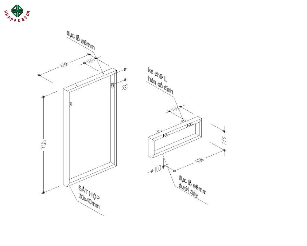 – Kích thước khung chân sắt: R438 x C733 (mm)