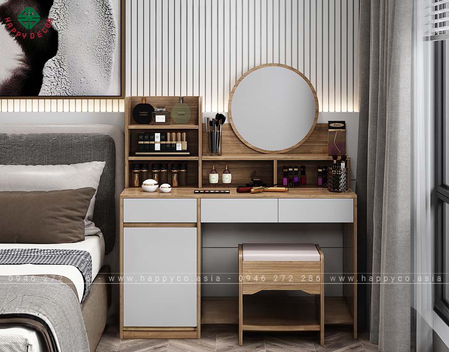 – Là mẫu bàn trang điểm gỗ hiện đại, kết hợp cùng những đường cong mềm mại, cho tổng thể sản phẩm cân đối, hài hòa đáng yêu. Tạo điểm nhấn ấn tượng đầu tiên với chiếc giường tròn xinh xắn phía trước. Bên cạnh đó công năng sử dụng của mẫu bàn này rất cao, chỉ riêng với phần giá phía trước đã mang lại cho bạn rất nhiều không gian để đồ mỹ phẩm. Bên dưới là 3 ngăn kéo giúp bạn có thêm không gian để các vật dụng nhỏ. Dưới cùng là một khoang cánh đóng mở lớn, bạn có thể sử dụng khoảng này làm nơi để túi xách, cùng nhiều vật dụng khác.