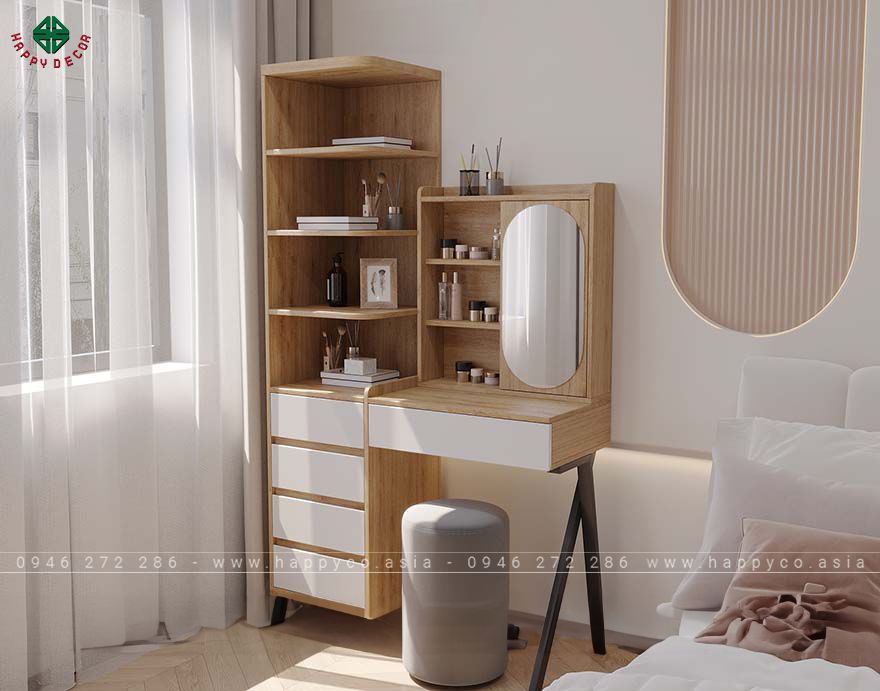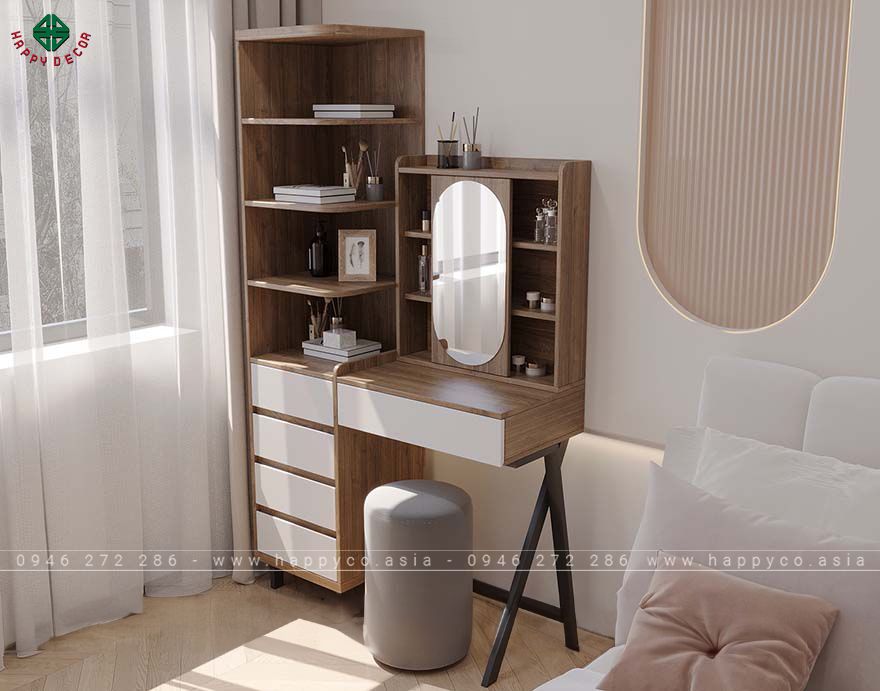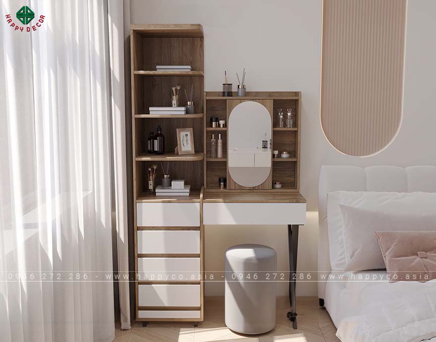 Chi tiết sản phẩm gồm có một gương soi lớn hình oval được bố trí ở vị trí trung tâm, giúp bạn dễ dàng trong việc trang điểm hoặc chăm sóc da mặt. Bên cạnh đó, bàn có nhiều ngăn kéo và kệ mở, cung cấp không gian lưu trữ rộng rãi cho các dụng cụ làm đẹp, mỹ phẩm và các vật dụng cá nhân khác. Màu sắc trung tính và thiết kế đơn giản của chiếc bàn này sẽ dễ dàng phối hợp với nhiều loại nội thất khác trong phòng ngủ hoặc phòng tắm của bạn.