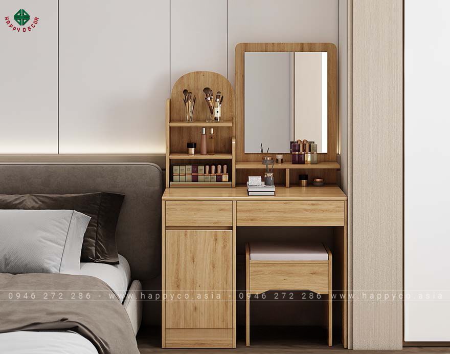 Trên mặt bàn còn giá để đồ với 2 tầng đặt cạnh chiếc gương và một tầng hai hộc phía trước gương giúp chị em phụ nữ có thể để những lọ mỹ phẩm thường xuyên dùng tới.
