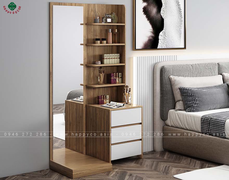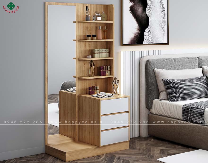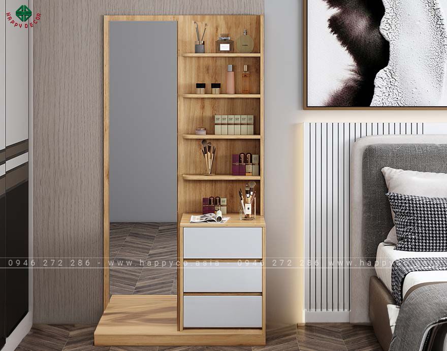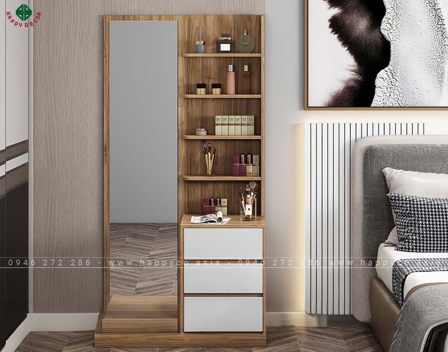 Là một trong số ít sản phẩm trên thị trường được thiết kế dạng gương đứng soi toàn thân. Nhưng không đơn giản như các mẫu khác trên thị trường, mà mẫu bàn trang điểm này kèm nhiều công năng khác. Phía trên cùng được tích hợp 4 lá trang trí, đồng thời làm nơi để mỹ phẩm thường xuyên sử dụng. Bên dưới còn 3 ngăn kéo để vật dụng khác, nhằm mang lại sự gọn gàng, tính thẩm mỹ cho không gian.