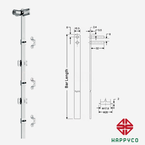 Thân khóa: Thường làm bằng hợp kim nhôm hoặc thép không gỉ. Thân khóa có thể được chia thành hai phần, mỗi phần được lắp đặt trên một cánh cửa.