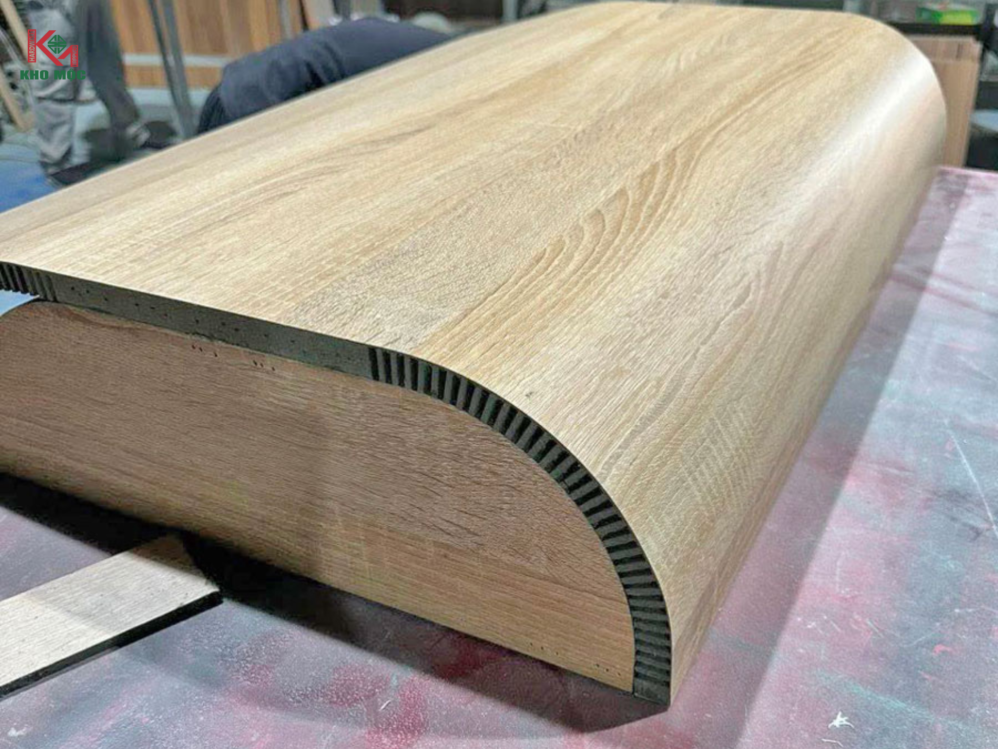 Ép lớp phủ lên ván bằng máy uốn cong hoặc khuôn gỗ định hình.