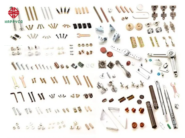 Có nhiều loại phụ kiện ngành gỗ như khóa, bản lề, tay nắm, ốc vít, ray trượt, bánh xe...
