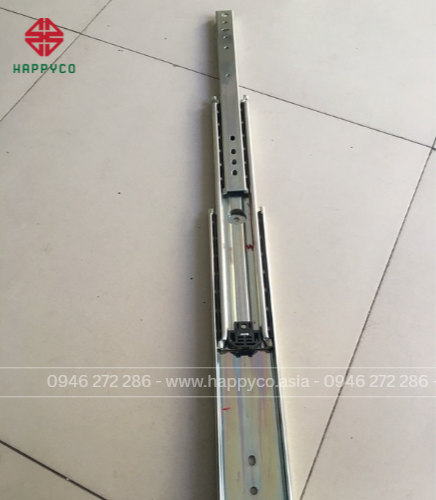 Đây là loại ray trượt được sử dụng nhiều nhất trong việc thiết kế ngăn kéo tủ bếp. Khác với các loại ray trượt 2 tầng, sản phẩm này cho phép toàn bộ chiều dài ngăn kéo được kéo ra hết. Tải trọng trung bình của ray nằm trong khoảng 30 – 45kg cũng tùy theo độ dày của thép và bản rộng của sản phẩm.