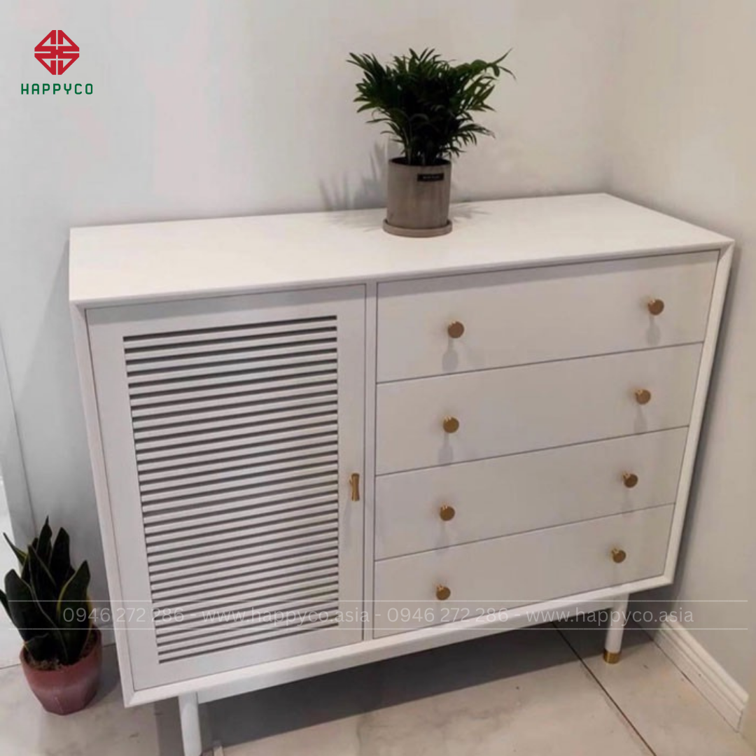 Tủ gỗ thông sơn màu trắng có tay nắm cửa tròn dẹp