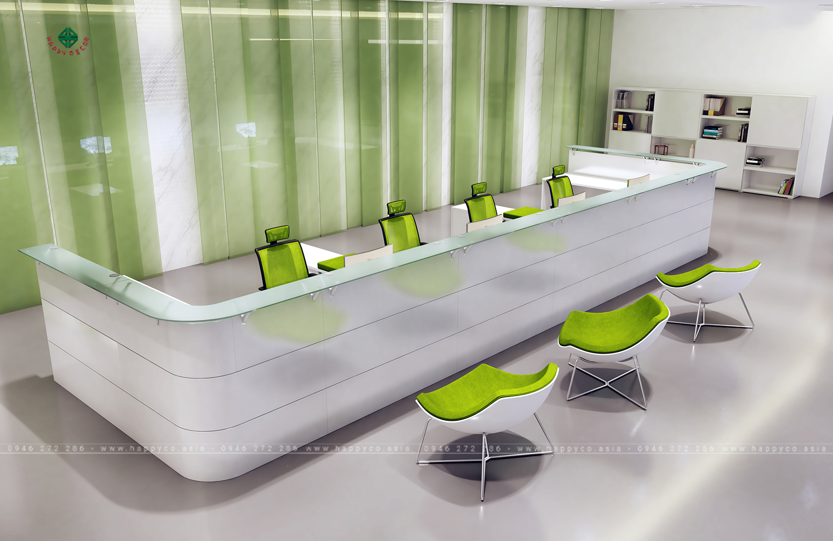 - Mẫu 30: Concept thiết kế bàn lễ tân hình vòm tinh tế kết hợp phong cách văn phòng xanh lá