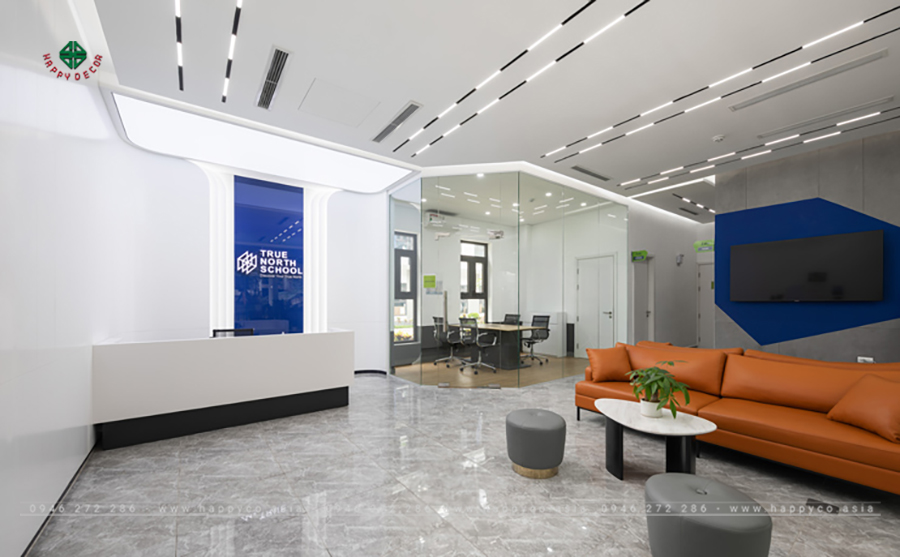 Phong cách thiết kế đơn giản, tối giản cùng tông màu nhẹ nhàng khiến không gian lễ tân của True North School hài hòa và lịch sự.
