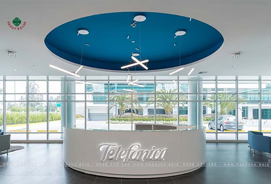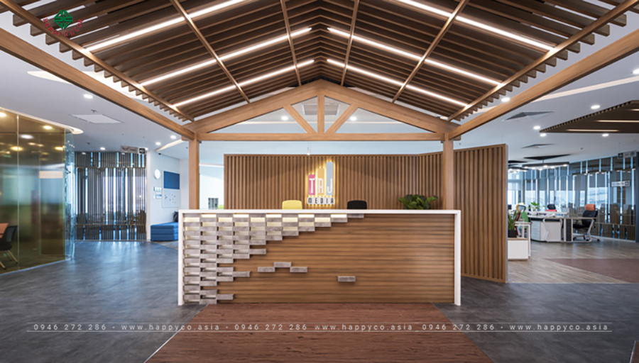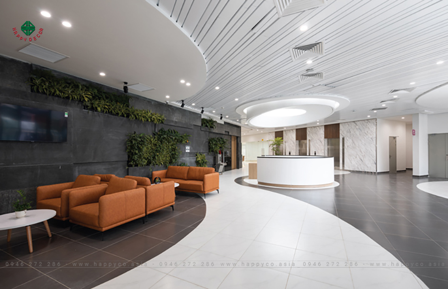Thiết kế trần nhà sáng tạo, đột phá cùng các chi tiết nội thất xếp lớp thể hiện phong cách và vẻ đẹp độc đáo, phù hợp với không gian lễ tân của các doanh nghiệp, xí nghiệp lớn.