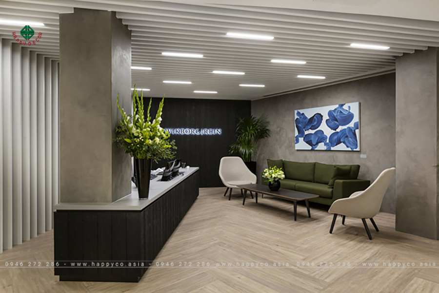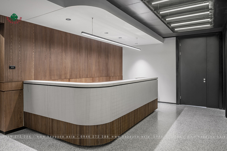 Vật liệu hiện đại kết hợp với cấu trúc khối xếp lớp ấn tượng truyền tải sự đẳng cấp và phong cách độc đáo cho khu vực lễ tân văn phòng yên bình.