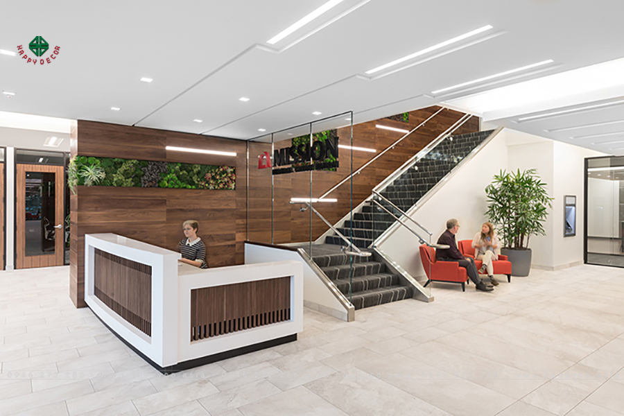 Sự kết hợp hài hòa giữa các yếu tố gỗ, đá và cây xanh mang đến cho không gian lễ tân văn phòng một bầu không khí thân thiện và để lại ấn tượng tích cực cho khách hàng.