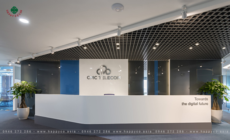 Thiết kế, màu sắc và trang trí bàn lễ tân hình chữ L đẹp mắt được phối hợp với phong cách nội thất chủ đạo càng làm tăng thêm vẻ đẹp hài hòa cho Văn phòng CMC Telecom.