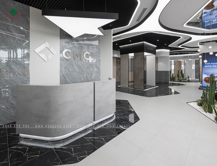 Thiết kế bàn lễ tân cong hình chữ U đẹp mắt, mềm mại kết hợp với nền chất liệu cao cấp tông màu tối thể hiện sự sang trọng, chuyên nghiệp của khu vực lễ tân lát gạch men CMC.