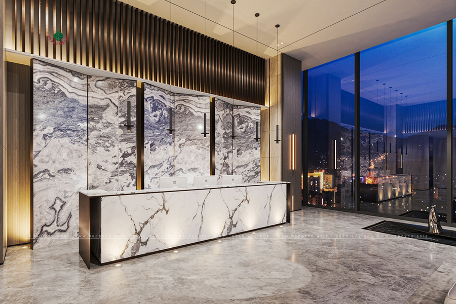 Phong cách thiết kế hiện đại và kết cấu bên trong nhỏ gọn giúp không gian lễ tân trở nên trang nhã và phóng khoáng hơn