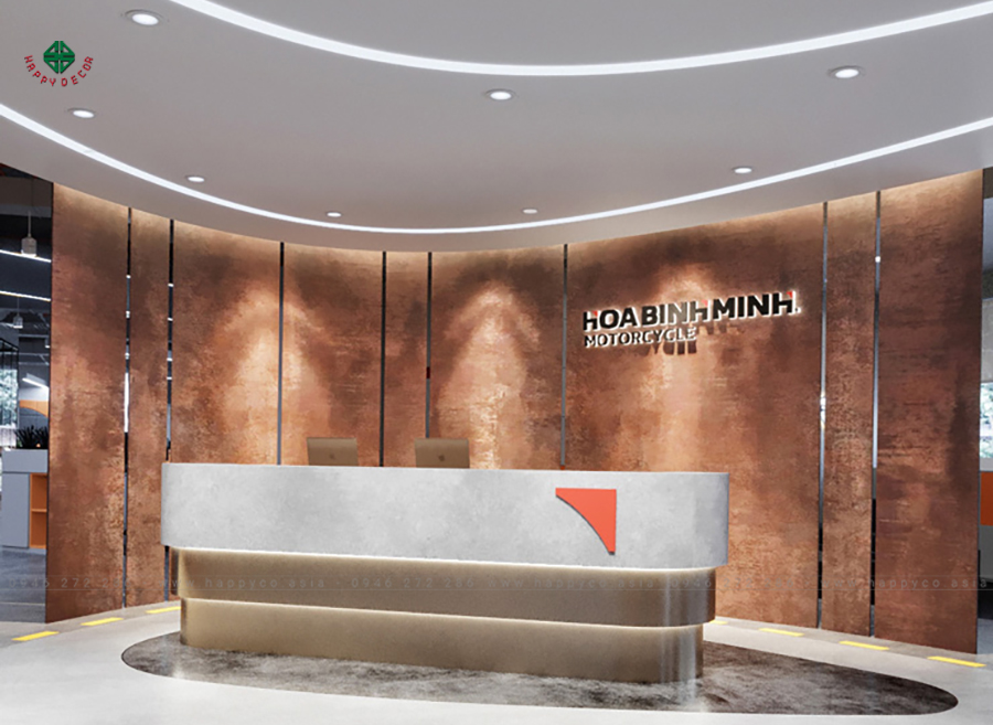 Bàn lễ tân cong mềm mại, sang trọng kết hợp với phông nền độc đáo tạo nên sự kích thích thị giác ấn tượng.