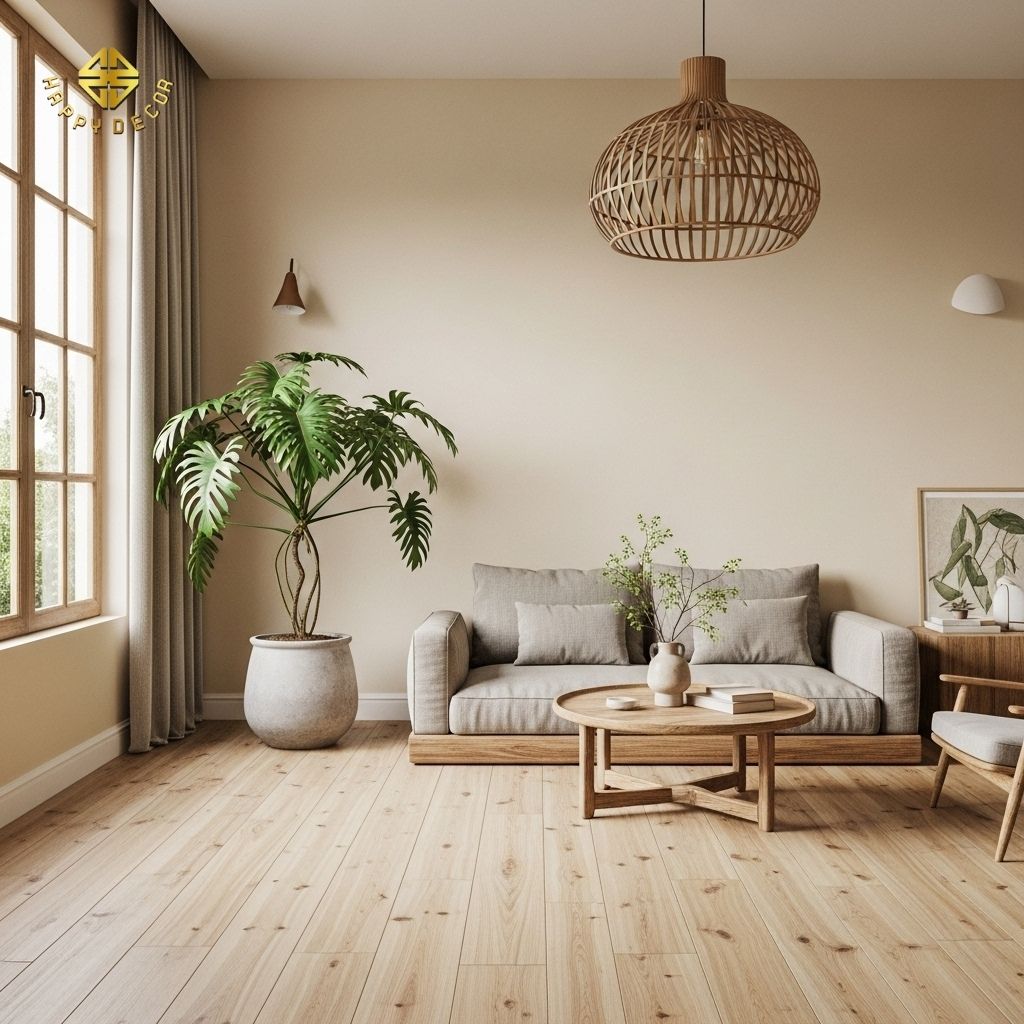 Vật liệu "Vàng": Gỗ sồi/tần bì sáng màu, vải linen, gốm sứ thô mộc.