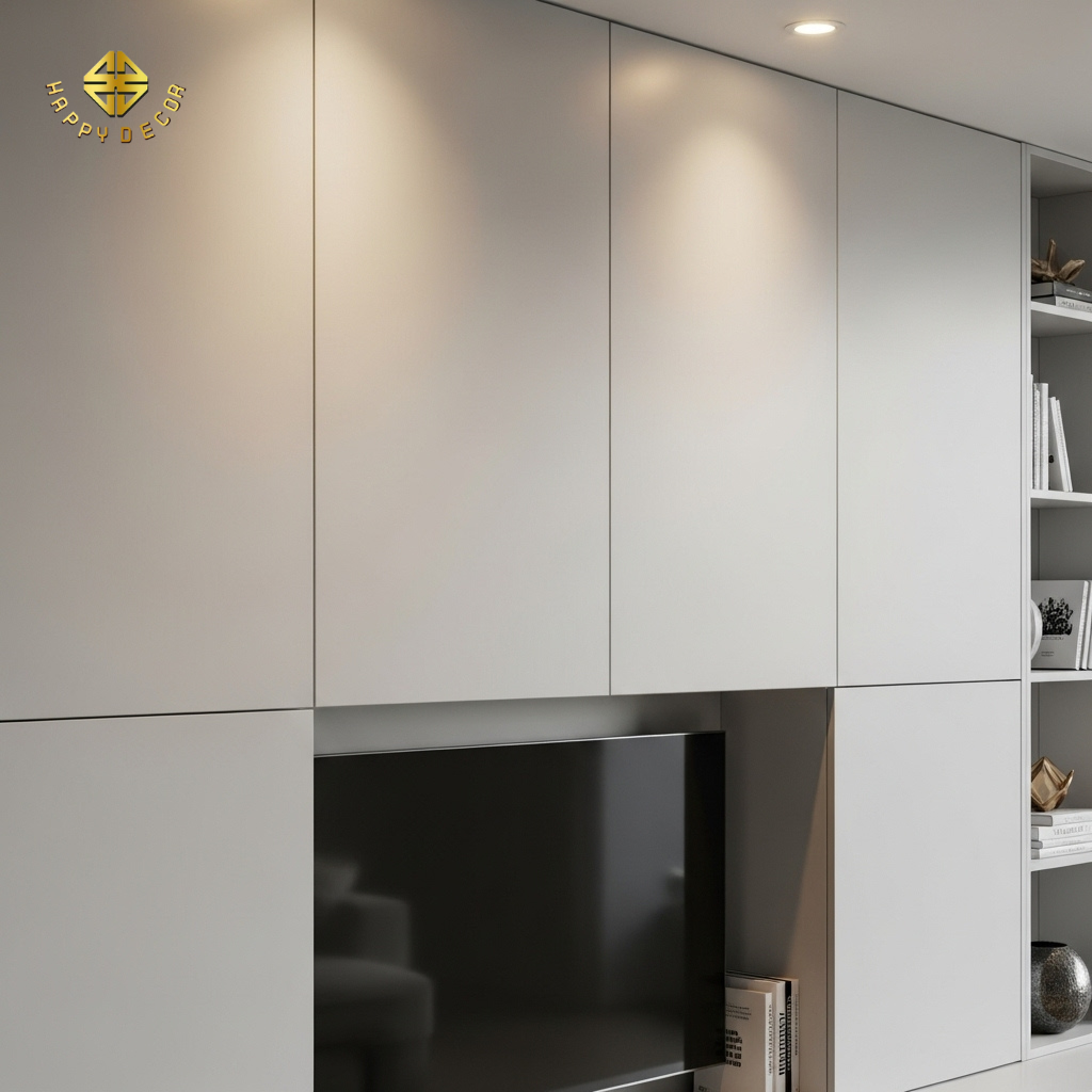 Kỹ Thuật "Giấu Đồ": Tập trung vào hệ tủ âm trần, âm tường không tay nắm, thiết kế cánh phẳng (ví dụ: Tủ quần áo kịch trần, tủ TV âm). Điều này tạo ra các bức tường phẳng tuyệt đối, giúp không gian có cảm giác rộng rãi và tĩnh lặng hơn.