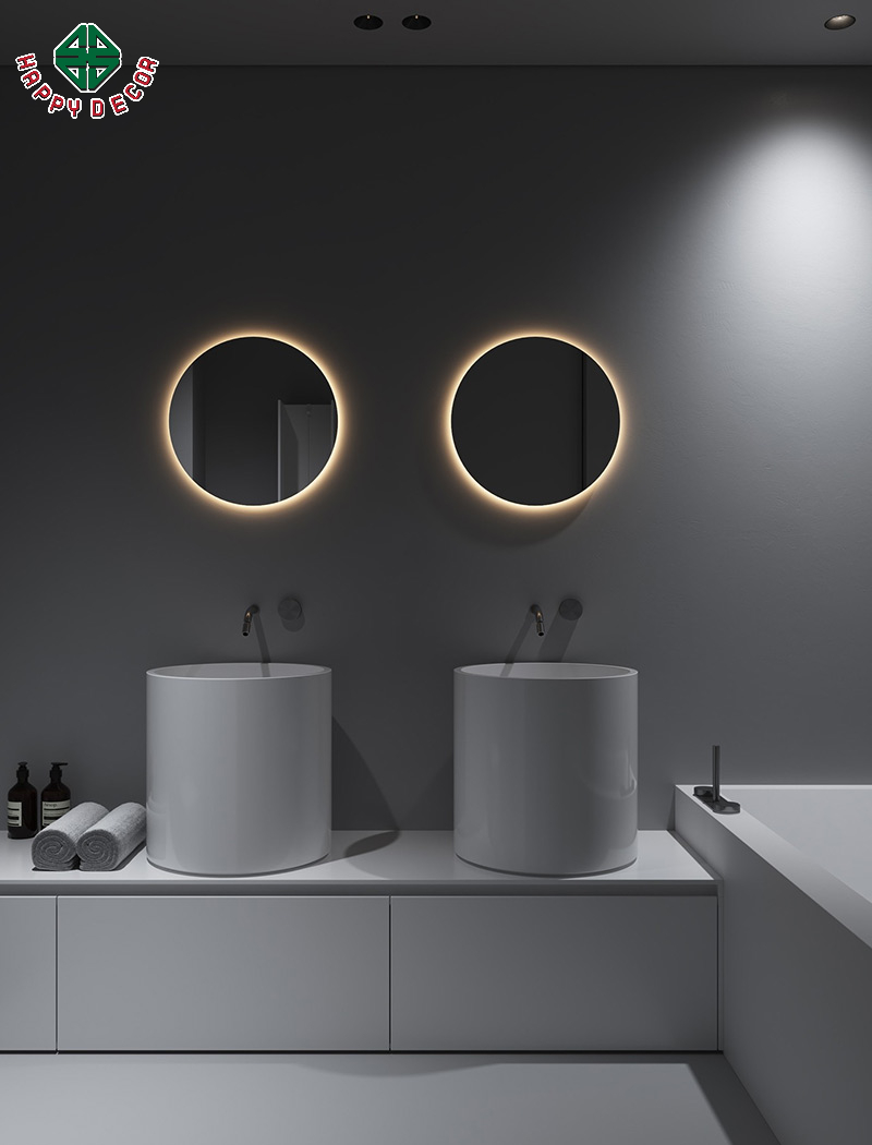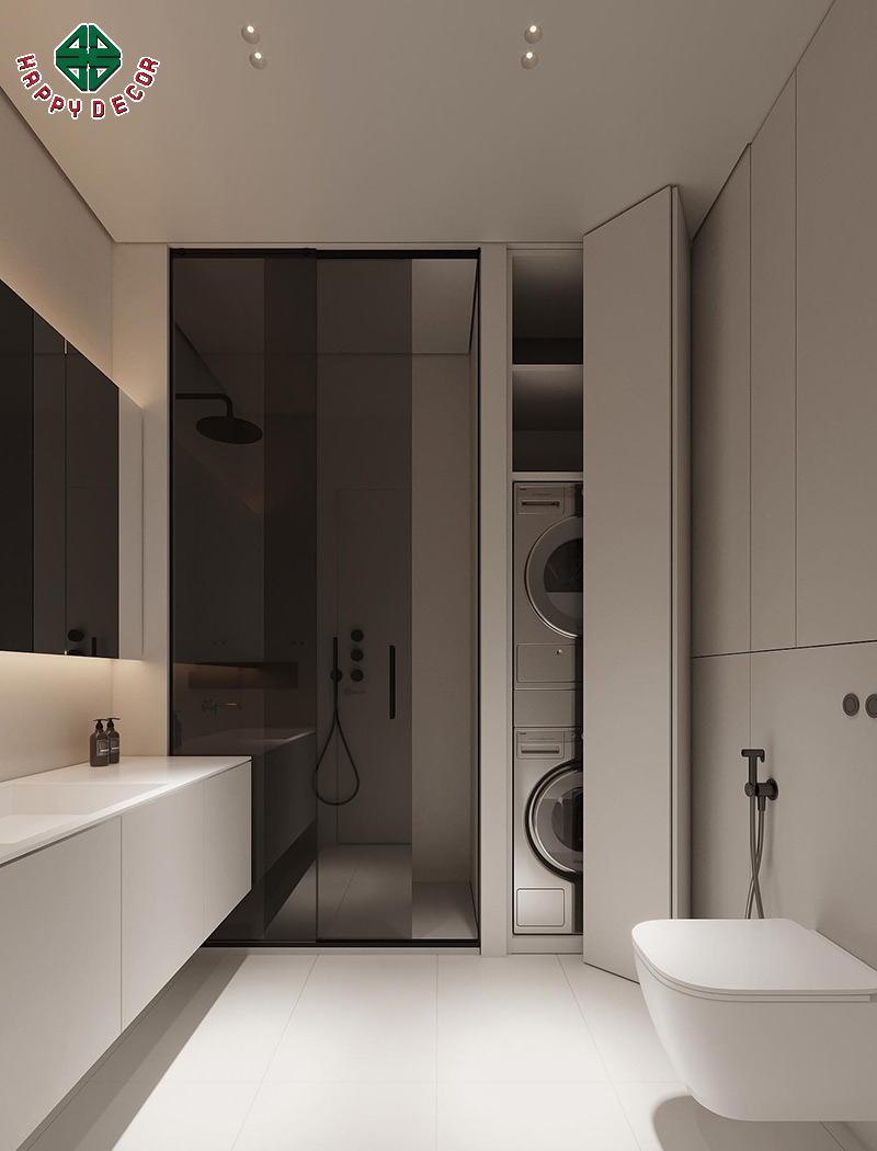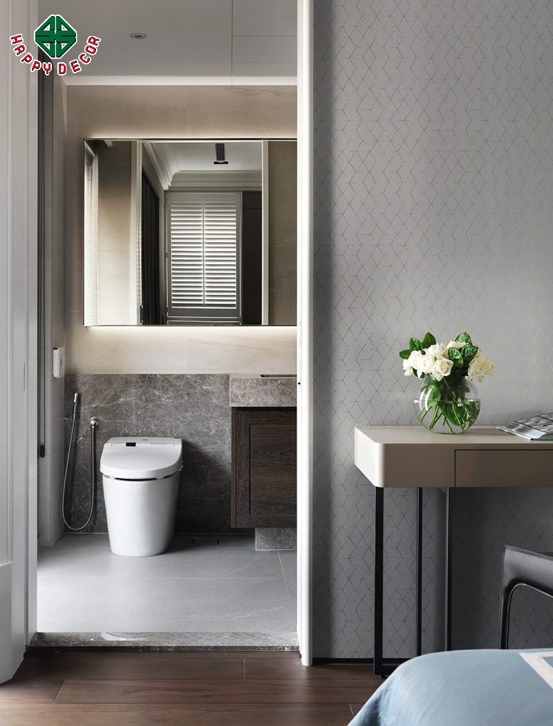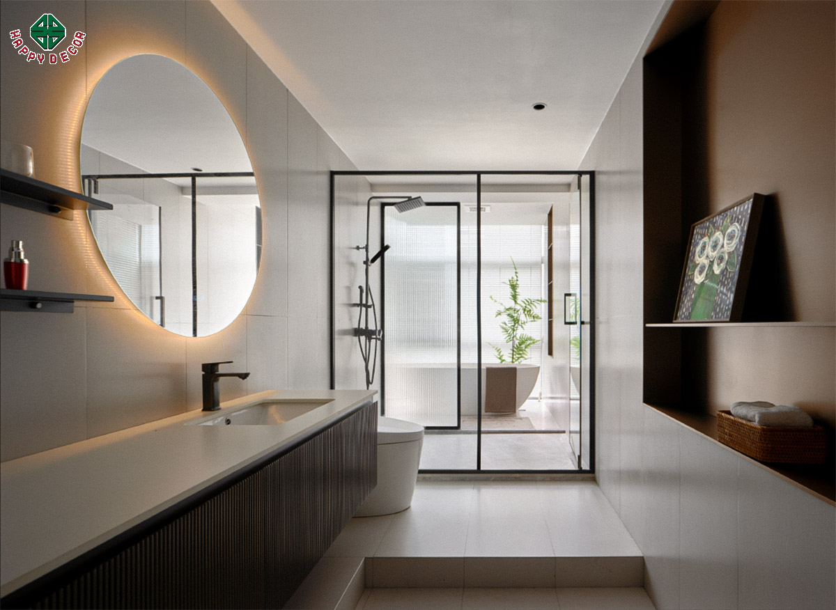 Happy Decor luôn chú trọng đến từng chi tiết nhỏ như hệ thống đèn LED viền gương, tay nắm tủ tinh tế hay các kệ gỗ được thiết kế giấu trong tường, giúp tối ưu không gian lưu trữ và tăng tính thẩm mỹ cho tổng thể căn phòng.