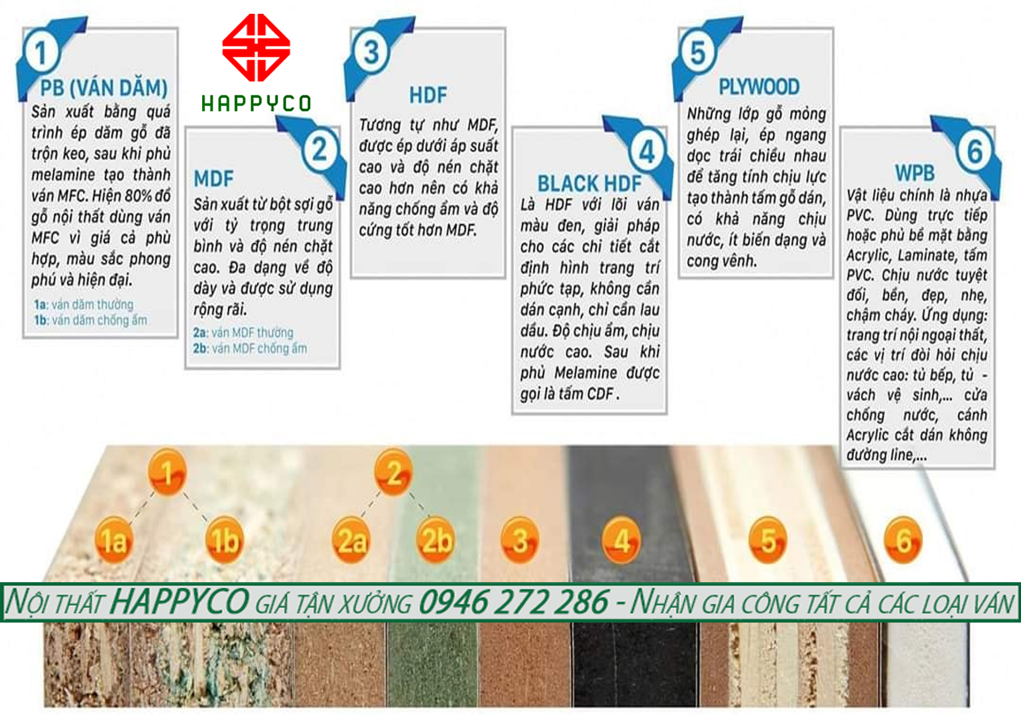 Cần phân biệt rõ giữa cốt gỗ là phần lõi bên trong và bề mặt phủ là tạo thẩm mỹ bên ngoài (bề mặt phủ thường có Melamine, Laminate, Acryic ). Có 6 loại gỗ công nghiệp chính đó là: