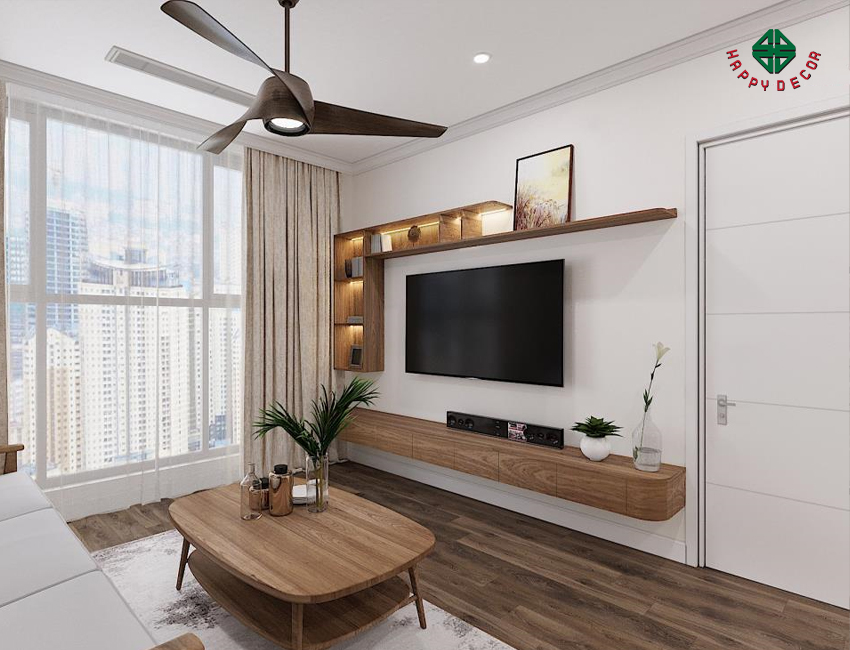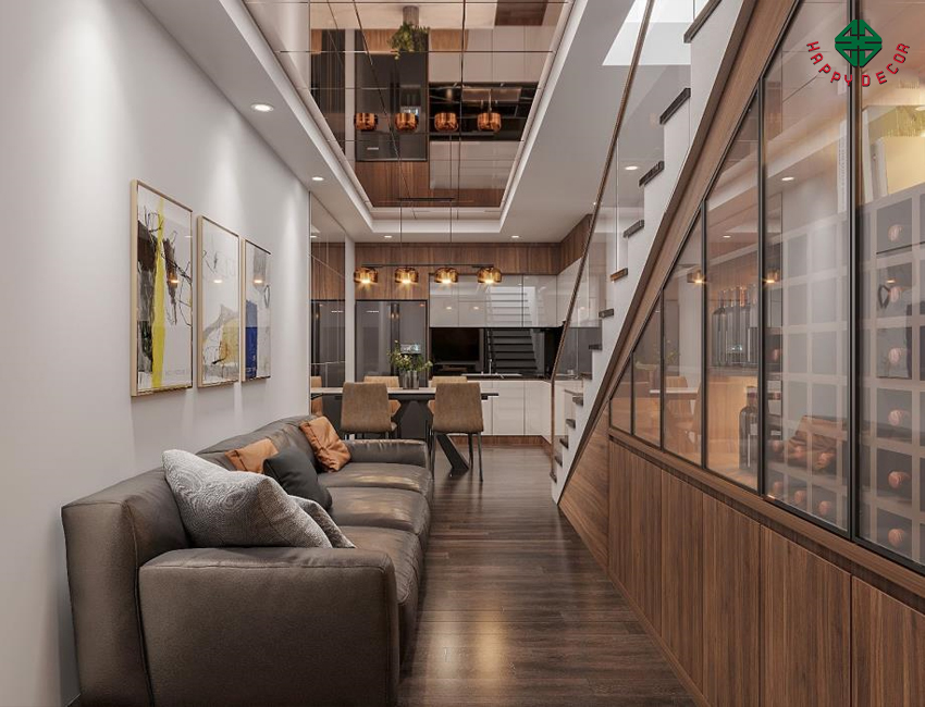 Phòng khách của nhà phố tuy nhỉ nhưng được thiết kế bởi gỗ công nghiệp, tối ưu mọi không gian sống