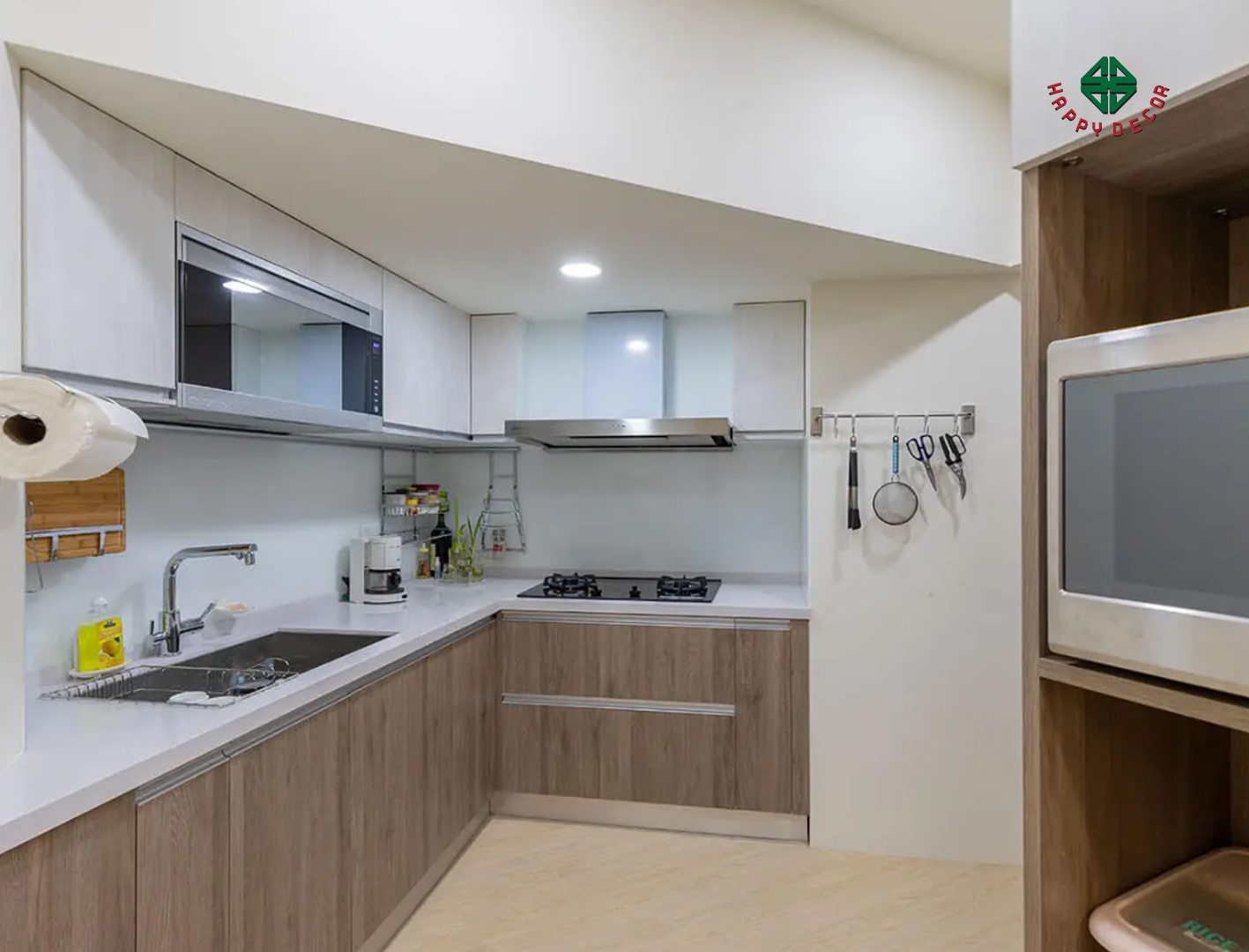 Phòng bếp được bố trí bên trái lối đi phía dưới là nơi đặt và cất giữ hệ thống tủ, hàng dưới là những tủ gỗ căm xe mang đến bầu không khí nhàn nhã tương tự như một ngôi nhà gỗ. dải khung nhôm được gia cố, đơn giản và bền; có tủ để đồ ở phía trên, có thể tùy chỉnh chiều cao và chiều rộng của bàn làm việc và bàn làm việc. Tủ, nồi cơm điện, lò vi sóng gia đình, tại đây.