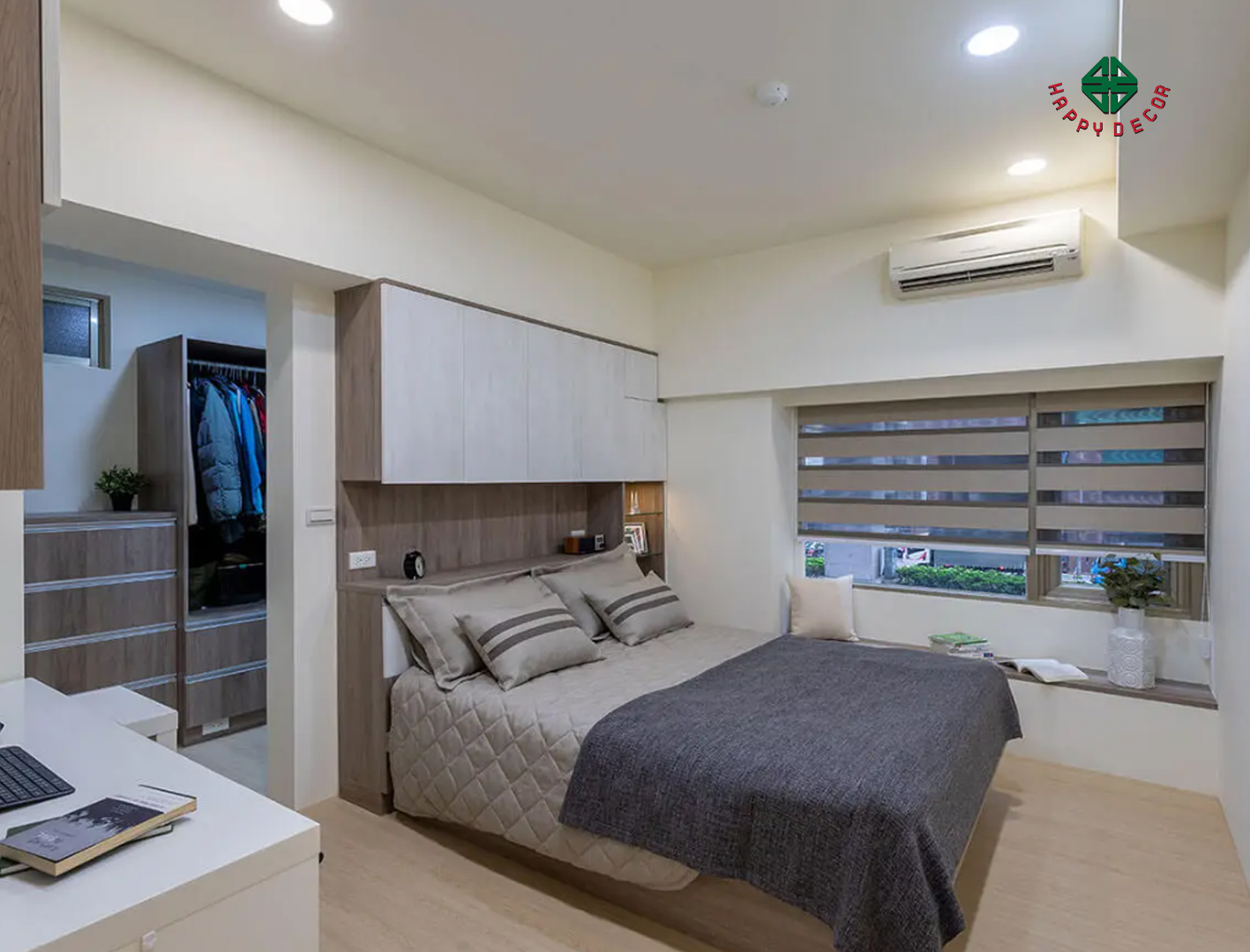 Hệ tủ 2 màu ghi và trắng được sử dụng trong phòng hài hòa với các ô tủ màu sáng trong toàn bộ ngôi nhà. đế giường tủ lưu trữ có thể nâng lên đủ lớn để vừa. Hai mền.