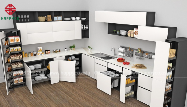 Ray ngăn kéo êm (3 tầng: dao muỗng / gia vị / nồi chảo), kệ góc (mâm xoay/magic corner), pantry 5–6 tầng, thùng rác âm tủ, tay nâng cửa lật, LED cảm biến. -