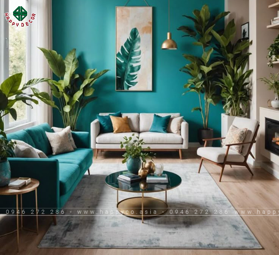 Happy Decor gợi ý cho bạn thử phối xanh ngọc lam với trắng ngà để tạo không gian tươi sáng, thoáng đãng. Thêm một chiếc sofa xám tro hoặc thảm cam đất để tăng sự ấm cúng. Đừng quên tận dụng ánh sáng tự nhiên – yếu tố quan trọng trong thiết kế không gian hiện đại.