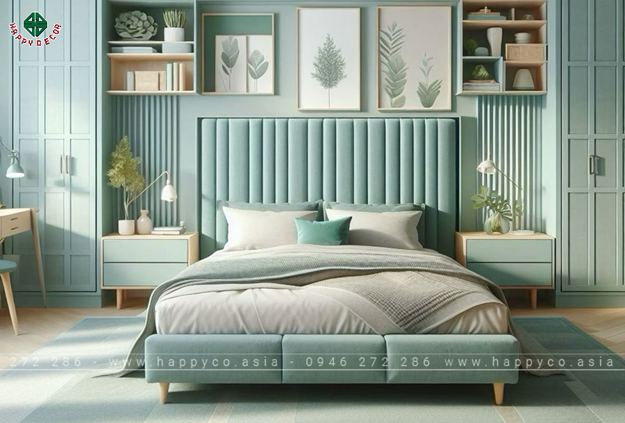 Phòng ngủ cần sự thư giãn, vì vậy xanh ngọc lam hoặc xám tro là lựa chọn hoàn hảo. Một chiếc giường trắng ngà kết hợp chăn ga xanh lá sẽ mang lại cảm giác dịu dàng, dễ chịu. Thêm kệ gỗ nhỏ hoặc đèn ngủ vàng ấm để tăng sự gần gũi.