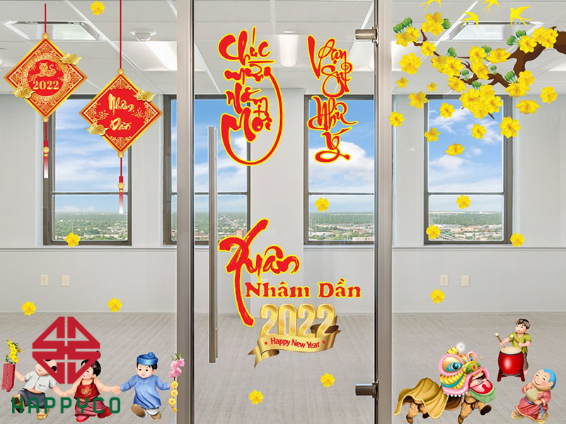 Cửa kính chính là điểm nhấn quan trọng nhất của công ty, vì vậy đừng quên phủ kín cho cửa kính những mẫu đề can trang trí Tết cực đẹp nhé!