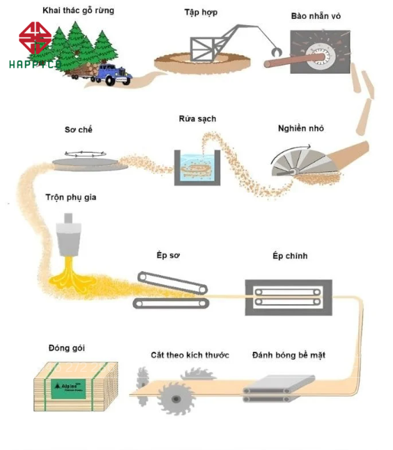 Quá trình sản xuất MDF (Medium Density Fiberboard) bao gồm các bước chính như sau:
