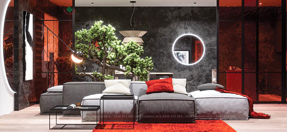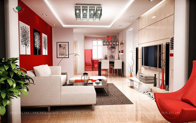 Màu sắc chủ đạo của phòng khách là màu đỏ