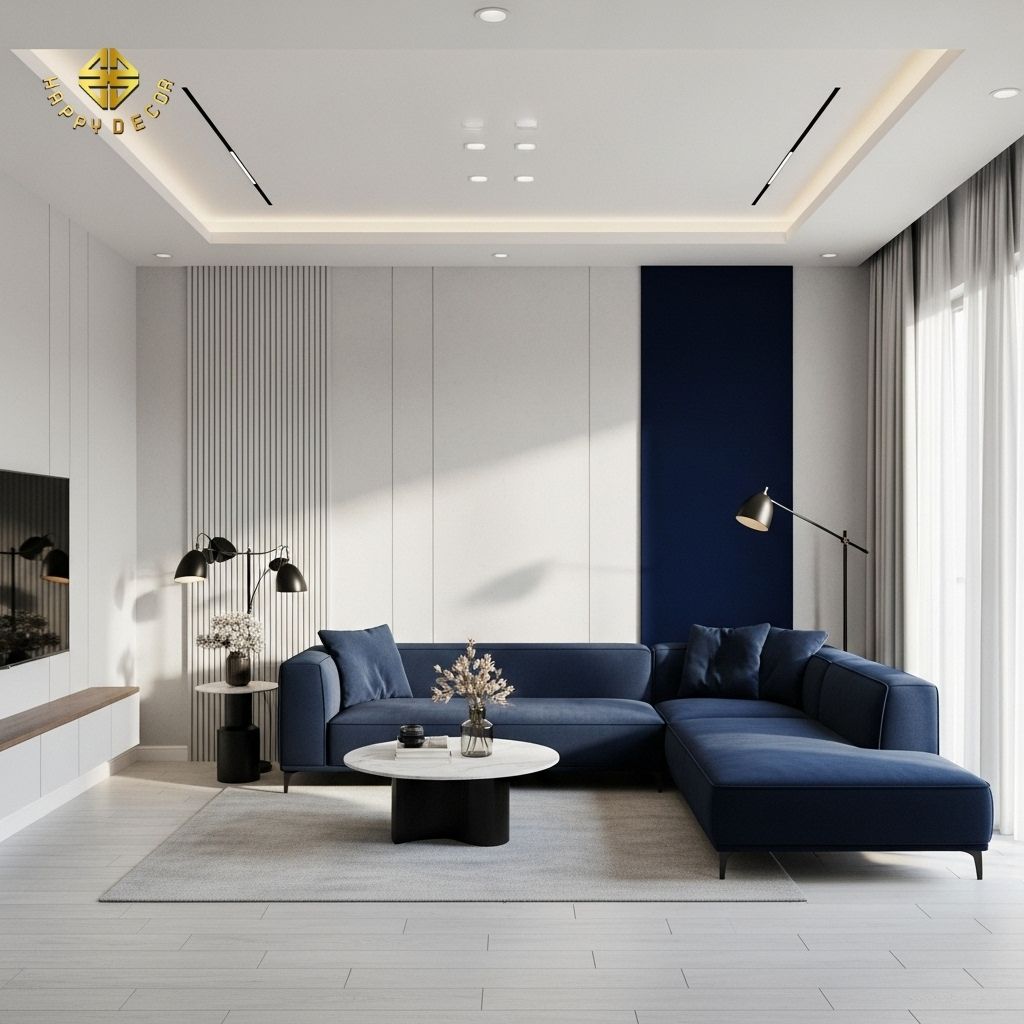 Màu Nhấn (Accent Color): Hiện đại cho phép sử dụng một đến hai màu nhấn mạnh mẽ (ví dụ: xanh navy, vàng mustard, đỏ đô) thông qua các vật dụng trang trí, gối tựa, hoặc tranh treo tường. Điều này tạo ra điểm nhấn thị giác, làm căn phòng có chiều sâu và cá tính hơn Minimalism.