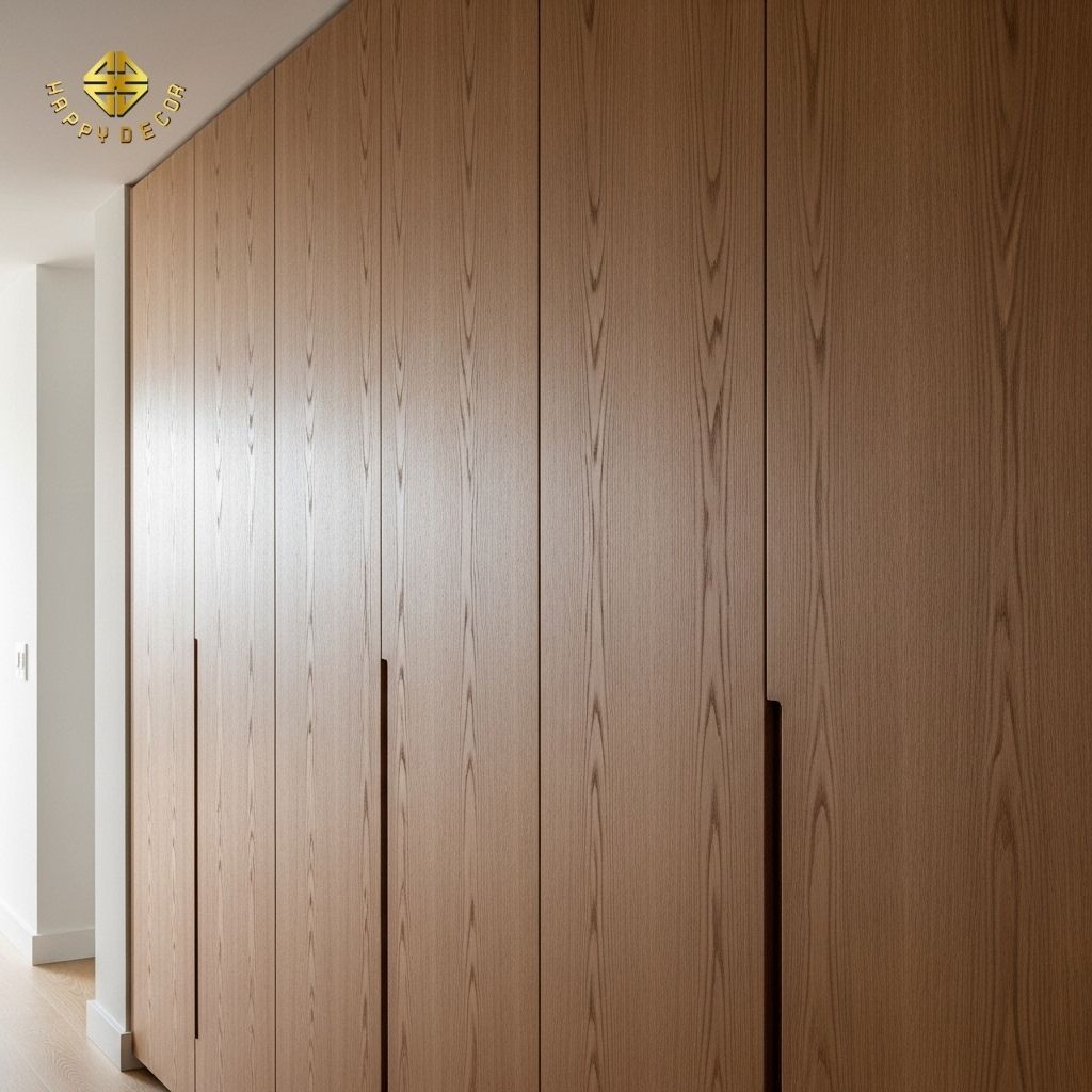 Kinh nghiệm Nghề Mộc: Các hệ tủ và kệ được thiết kế theo nguyên tắc "built-in" (âm tường hoặc cố định) để tạo sự liền mạch và gọn gàng, phù hợp với sự chính xác của phong cách Hiện đại.