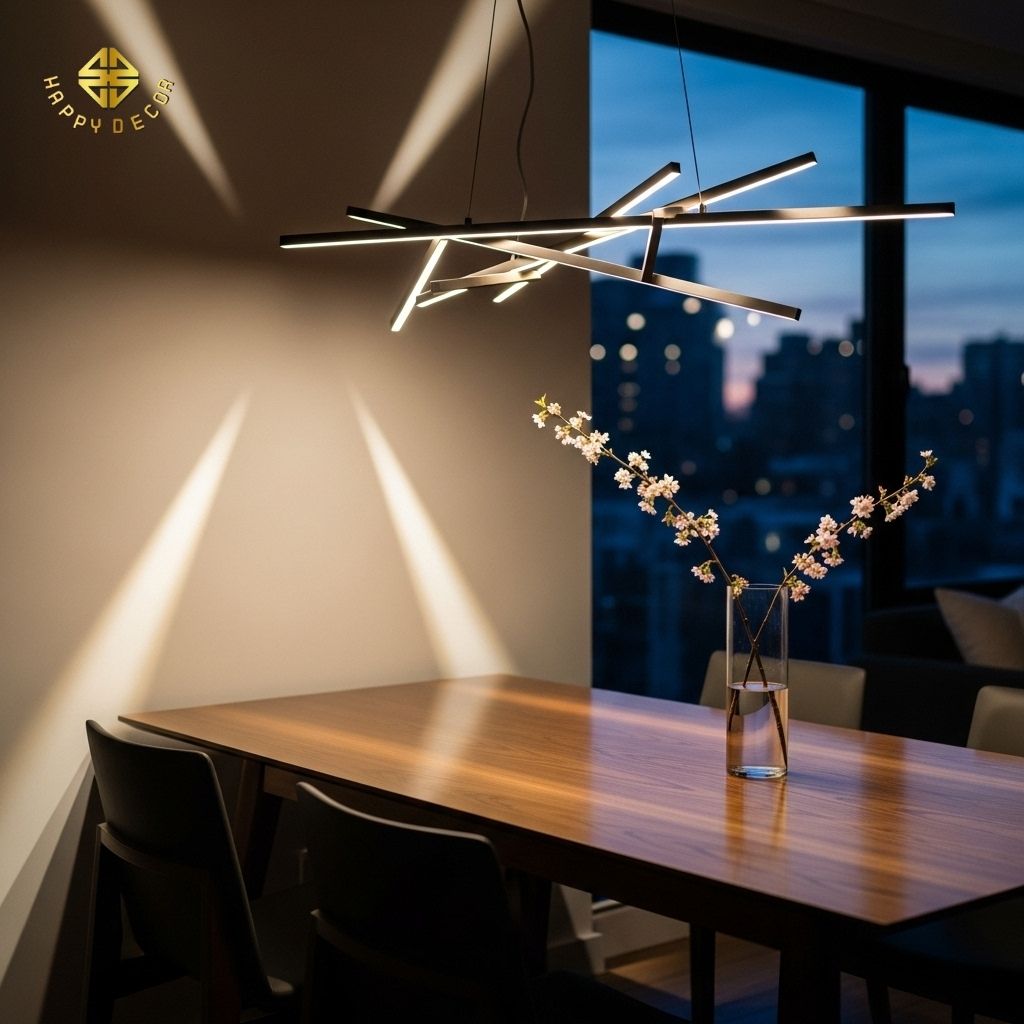 Sử dụng Đèn Hình Học: Lựa chọn các loại đèn trần, đèn sàn, đèn thả có hình học sắc nét (hình hộp, hình trụ, hình học trừu tượng) bằng kim loại, thủy tinh hoặc composite.