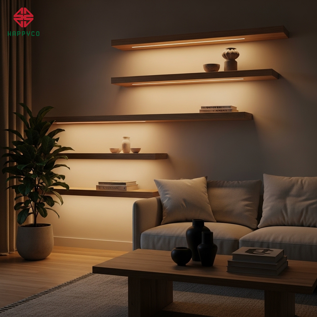 Kỹ thuật Layering Light: Thay vì dùng đèn trần công suất lớn, Happy Décor sử dụng các dải LED dây dán 12V ẩn dưới các khe tủ, kệ trang trí.