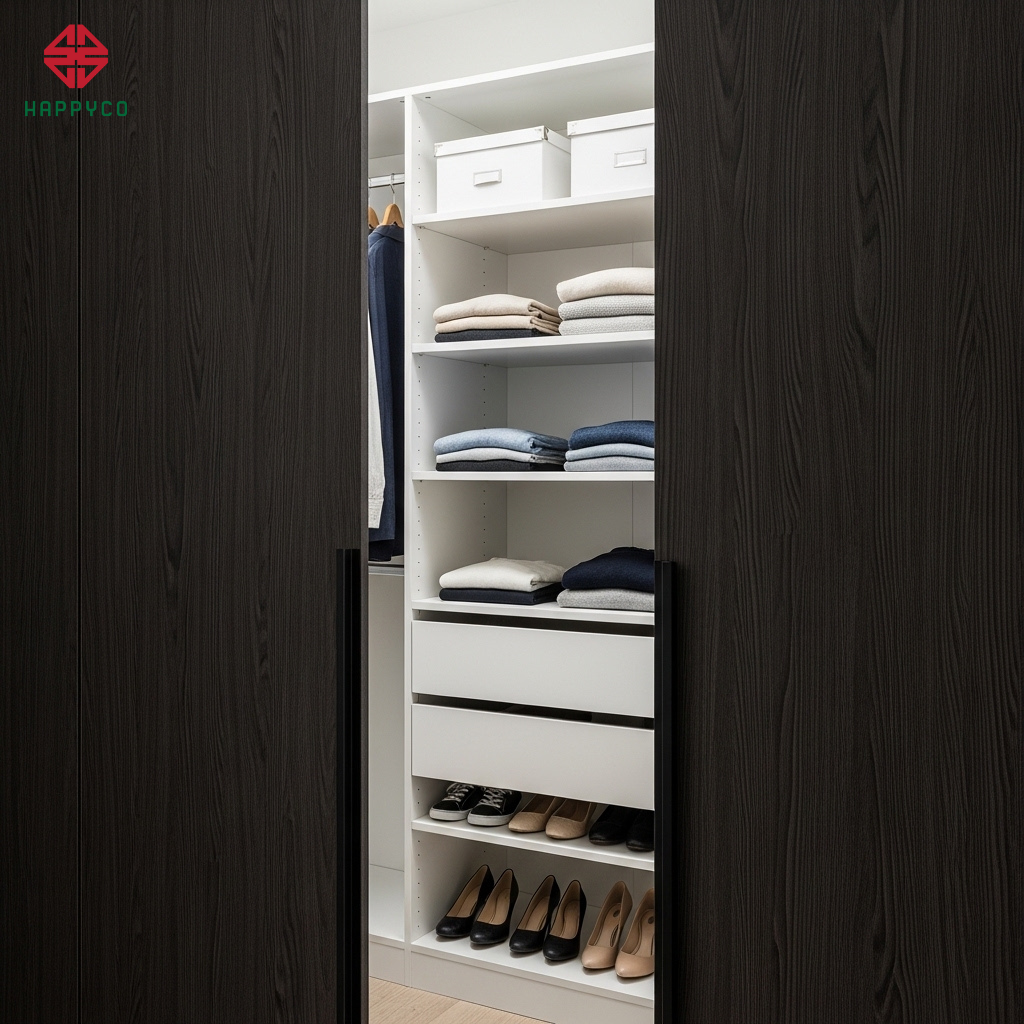 Kỹ thuật phối hợp: Đối với những khoang tủ ít sử dụng hoặc phần thùng tủ khuất bên trong, Happy Décor tư vấn sử dụng gỗ MDF HMR lõi xanh phủ Melamine trắng tiêu chuẩn. Tuy nhiên, phần Cánh tủ (mặt tiền) – nơi trực tiếp tạo nên vẻ đẹp của ngôi nhà – chúng tôi sẽ ưu tiên các dòng Acrylic bóng gương, Laminate chống trầy hoặc Sơn Inchem cao cấp.