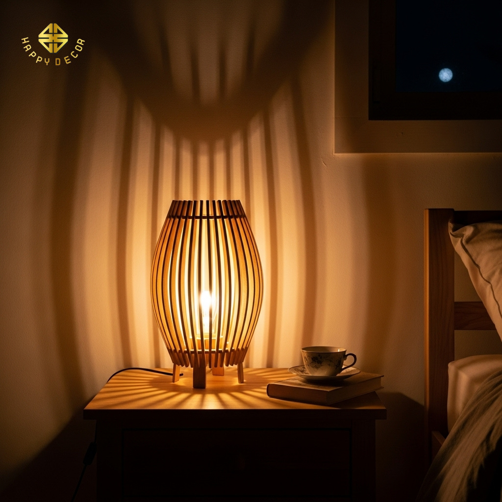 Sáng tạo: Ghép các thanh gỗ thành khung hình hộp, khoét rỗng và đặt dây LED vào bên trong. Ánh sáng xuyên qua các khe gỗ sẽ tạo ra hiệu ứng bóng đổ cực kỳ ấm cúng cho phòng ngủ.