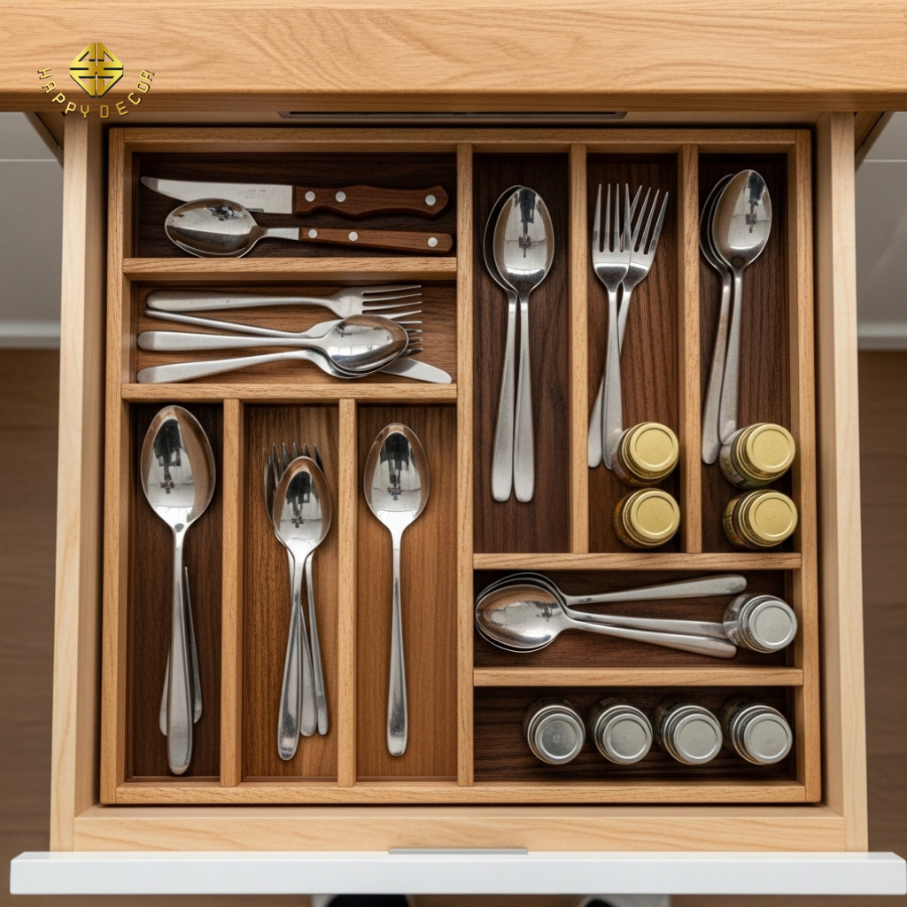 Giải pháp: Tận dụng gỗ vụn để đóng các vách ngăn chia ô cho ngăn kéo hoặc kệ gia vị 2 tầng đặt ở góc chết của tủ bếp.