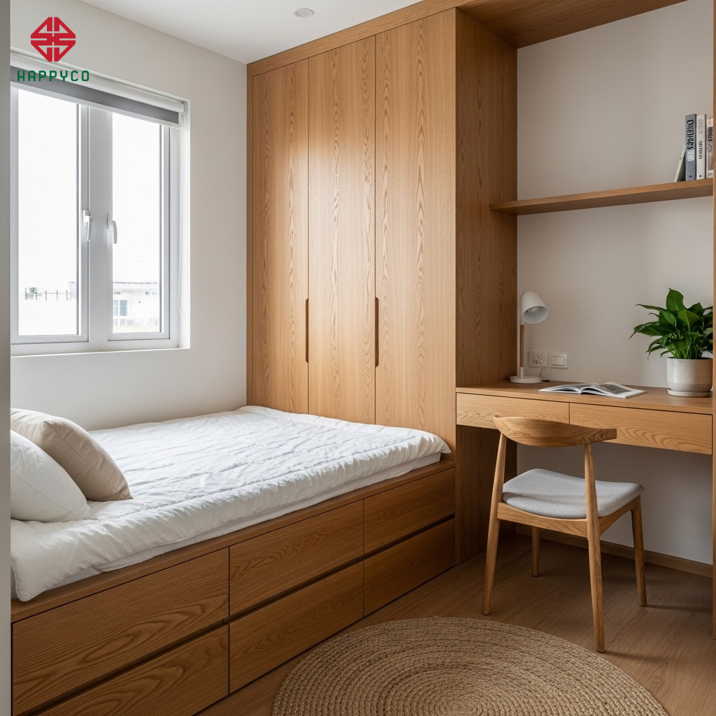 Giải pháp thi công: Chúng tôi thiết kế hệ giường bục (Platform bed) tích hợp các ngăn kéo phía dưới để thay thế hoàn toàn tủ kho. Bàn làm việc được tích hợp vào hệ tủ quần áo kịch trần, có thể gập lại khi không sử dụng.