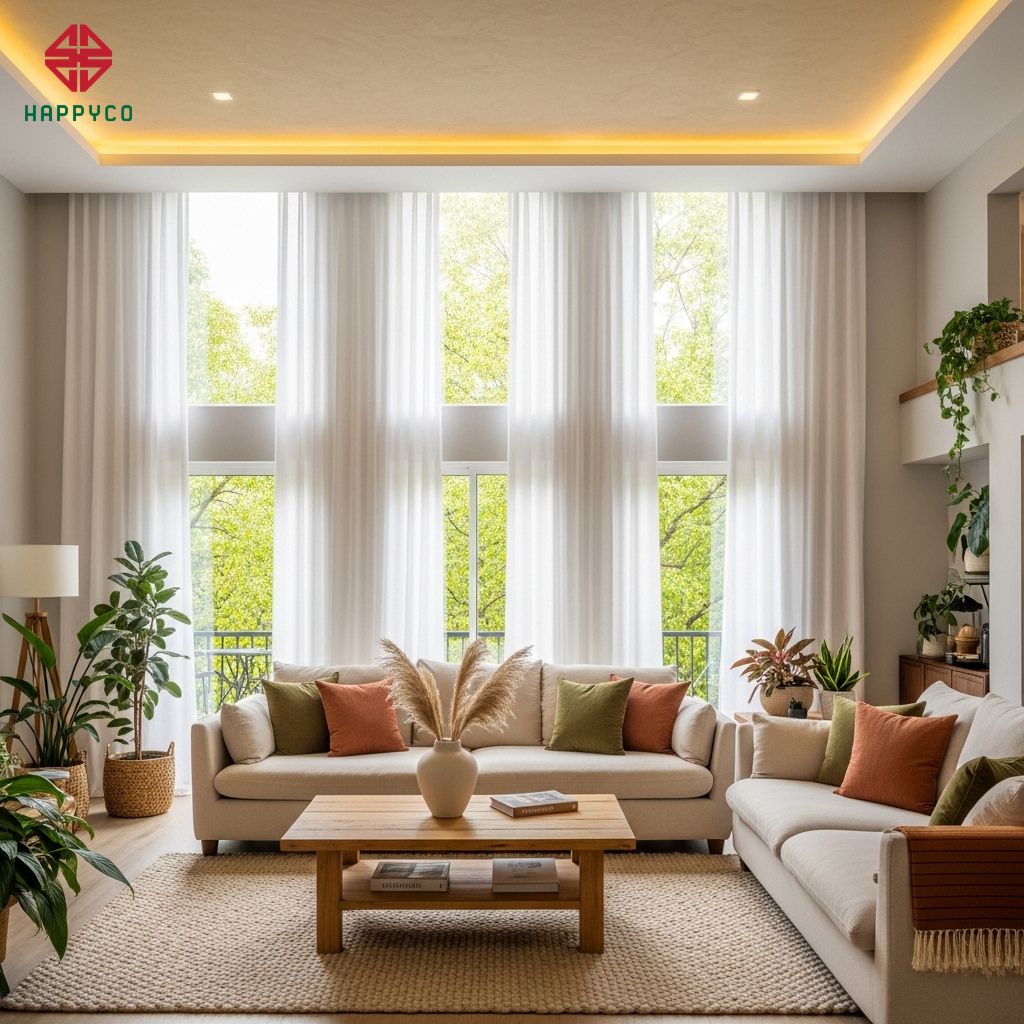 Tận dụng thiên quang: Happyco tối ưu hóa hệ thống cửa sổ lớn và rèm cửa hai lớp để điều tiết ánh sáng tự nhiên. Ánh nắng mặt trời là nguồn năng lượng "Dương" mạnh nhất giúp hóa giải vận xui.