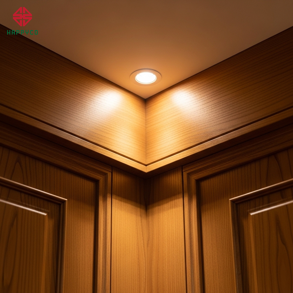 Chỉn chu từng milimet: Tại Happyco, các đường ghép nối giữa gỗ và đá, các cạnh ván MDF hay Plywood đều được xử lý sắc sảo. Một không gian hoàn thiện khít khao, bền bỉ theo thời gian chính là minh chứng cho một gia đạo bền vững, sung túc.