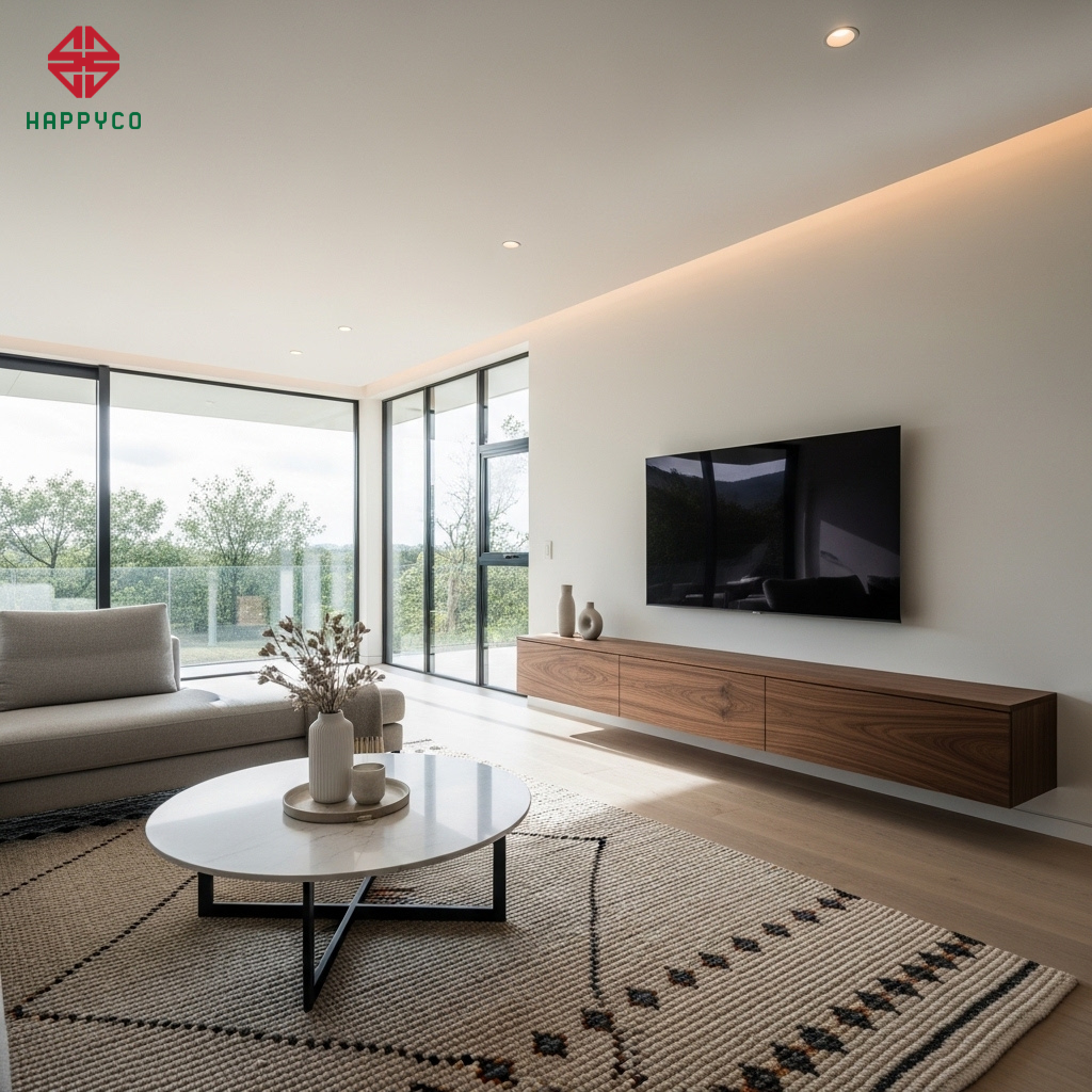 Thiết kế phẳng và thoáng: Happyco ưu tiên các mẫu bàn trà thấp, hình tròn hoặc bo cạnh mềm mại để khí xoay chuyển nhẹ nhàng, không bị đứt đoạn. Chúng tôi cực kỳ bài trừ việc nhồi nhét quá nhiều đồ đạc ở khu vực này, gây tắc nghẽn luồng tài lộc.