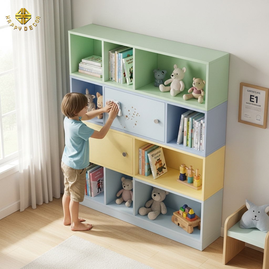 Tiêu chuẩn phát thải thấp E1: Happy Décor chỉ sử dụng cốt ván lõi xanh đạt chuẩn E1 từ Kho Mộc. Đây là dòng ván có nồng độ phát thải cực thấp, không gây cay mắt, không gây dị ứng hô hấp, đảm bảo bầu không khí trong phòng con luôn tinh khiết.